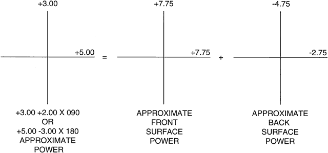 The next logical step was to grind the spherical and cylindrical powers on one piece of glass instead of cementing two components together. At first, one surface had the entire sphere power and the other was a plano cylinder. As optical manufacturing technology and production methods improved and commonly used lenses became more steeply curved, toric surfaces (with both meridians curved, rather than one plano meridian and one curved meridian) became necessary and available. Currently, nearly all lenses that correct astigmatism have one spherical surface and one toric surface. The toric surface is the back surface for essentially all lenses, so this lens type is termed a minus cylinder design. A patient's lenses are made in minus cylinder design regardless of whether the lens prescription is written in plus-cylinder or minus-cylinder notation. Figure 13 illustrates, using optical crosses, the surface powers used to make a minus cylinder design lens of power + 3.00 + 2.00 × 090, or + 5.00 -2.00 × 180. The lens has a base curve of + 7.75 D. Many possible combinations of surface powers exist that provide the proper lens power. The surface powers chosen by a lens designer are usually those that provide a lens with the sharpest image across the patient's field of view. |