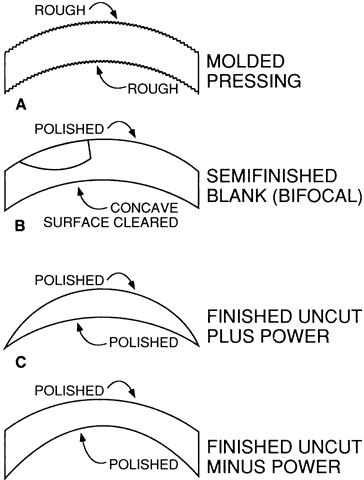 following three types of lens blanks are in use. ROUGH BLANK Glass lenses are formed by grinding and polishing a molded pressing or rough blank (Fig. 14A). A pressing is a rough, unpolished piece of glass having a meniscus shape, with the surface curves approximating those to be eventually ground on it. Its diameter is that intended for the finished lens. Pressings are usually formed immediately after a gob of molten glass is drawn from the tank where the raw ingredients have been combined. Each gob is pressed between the curved surfaces of a metal mold and allowed to cool. Alternatively, the glass can be drawn from the tank and rolled out into sheets that are cut into lens-sized squares, then shipped. In the molding room of a lens manufacturer, these squares can be reheated and formed into round meniscus-shaped pressings. Optical laboratories rarely use pressings.
