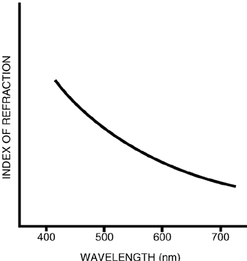 CR-39 CR-39 (PPG Industries, Pittsburgh, PA) is the standard ophthalmic plastic currently in use. CR-39, which is allyl diglycol carbonate or allyl resin, was developed during World War II. Graham and associates, of Armorlite Optical, developed a practical method for molding lenses from CR-39 in 1948.2 For many years, CR-39 had only a minor role in the optical industry, but in the late 1960s and early 1970s, as frame styles became larger and weight became a more important concern, the use of CR-39 began to increase. Today, CR-39 plastic lenses make up approximately two thirds of domestic lens shipments by U.S. manufacturers.1 Weight and Thickness CR-39 has the lowest index of refraction of all currently used spectacle lens materials, so lenses made of CR-39 are thicker than those made from other materials. However, CR-39 has approximately one half the density of the standard spectacle lens glass, ophthalmic crown, so CR-39 lenses are about one half the weight of glass. Base Curve Design for CR-39 Lenses Factory-finished uncut CR-39 lenses are cast in glass molds separated by rubber-like gaskets to provide the required thickness. The material has a shrinkage factor of approximately 14% during the casting process. This shrinkage alters the lens curves and changes the tangential and sagittal errors from their expected values. For most prescriptions, this is not a serious problem. However, for factory-finished uncut lenses, tables of off-axis performance as a function of base curve cannot be used for comparing the performance of the lenses from different manufacturers. Semifinished CR-39 plastic single-vision and multifocal blanks are not affected significantly by shrinkage during the casting process because the blanks are kept to a more uniform thickness than is possible with finished lenses and the shrinkage does not modify the spherical surfaces. The second surface is ground and polished in the optical laboratory. Off-axis performance can be predicted by the design curvatures. There are small differences in the theoretical performance between crown glass and ground and polished plastic lenses. Little information is available concerning the optical performance and base curve designs of CR-39 plastic lenses. The prescriber and dispenser should use only those products for which information is supplied. Warpage When a plastic lens is inserted into a frame that is too small for the lens, the lens often flexes or bends. This warpage of the lens results in a change in the lens curves. A patient wearing a warped lens may complain that “things just do not seem right,” although the lens powers are correct and visual acuity is the best possible. It is always worthwhile to check for warpage when a patient is having difficulty adapting to a new spectacle prescription. Warpage is measured using a lens clock. Because spectacle lenses are made in minus-cylinder design, the front surface of a lens should be spherical, with the same front surface power in all meridians. If measurements with a lens clock show that the front surface is toric, then warpage is present and the amount of warpage is the amount of toricity, the difference between the maximum and minimum lens clock readings. The American National Standards Institute (ANSI) Z80.1-1995 standard3 allows only 1.00 D of warpage in a lens. Lenses with larger amounts of warpage should be remade or edged to a slightly smaller size to eliminate the pressure on the lens from the frame. The pressure of a spectacle frame on a lens may also cause smaller, localized areas of bending or warpage, usually at locations within about 5 mm of the eyewire, where there are sharp corners. The wearer sees an abrupt bending of straight lines that are viewed through the affected area. Again, a slight modification to the edge of the lens by an optician often can eliminate the problem. Color Aberrations All spectacle lens materials exhibit dispersion, the variation of index of refraction with wavelength (Fig. 1). Index of refraction is highest for shorter (blue) wavelengths and lowest for longer (red) wavelengths. The ophthalmic industry quantifies the dispersion of a lens material using the Abbe number or Þgn value, defined as follows3: