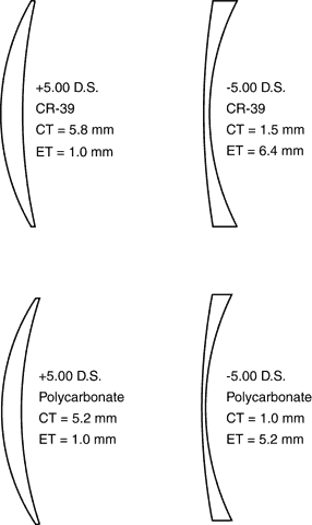(1) Abbe number = nd - 1nf - nc where nd is the index of refraction of the lens material for light of wavelength 587.56 nm, nf is the index for a wavelength of 486.13 nm, and nc is the index for a wavelength of 656.27 nm. Materials with higher Abbe numbers have less dispersion and are less likely to cause problems with chromatic aberration. As a general rule, the Abbe number tends to decrease as index of refraction increases, so materials of higher index have more dispersion than lower index materials (see Table 1). CR-39 plastic and ophthalmic crown glass have the highest Abbe numbers of all lens materials. Problems with transverse chromatic aberration are rare for these materials. Transmittance and Reflectance The amount of light transmitted through a lens depends on the reflectance at each surface and on the amount of light absorbed by the material. Neither CR-39 plastic nor crown glass has any appreciable absorption of visible light, so all transmittance losses are by reflection. Reflectance from the lens surfaces is a function of index of refraction; the higher the index, the higher the reflectance. CR-39 plastic and crown glass have similar indices so reflections are similar in magnitude. A clear crown glass lens reflects 4.3% of the incident light at each surface and transmits 91.6% through the lens. A CR-39 plastic lens reflects 4.0% at each surface and transmits 92%. For practical purposes, the reflections and transmittances for the two materials are the same. Fogging Fogging is a problem that all spectacle wearers encounter in the winter. After a prolonged exposure to cold air, the lenses immediately “steam up” or fog when brought into a warm, humid room. Fogging occurs when the temperature of the lenses is lower than the dew point of the inside air. There is condensation on any article under these conditions. The widespread belief that plastic lenses resist fogging better than glass is erroneous. Neither logic nor experiment supports it. CR-39 and other plastics have a lower thermal conductivity than glass. When the fog forms, it clears more slowly from plastic than from glass because the lens warms more slowly. For very brief encounters with cold air, plastic could have the advantage because it does not have time to cool below the critical temperature. Regardless, the differences in fogging are too slight to be a criterion for decision except in unusual cases, for example, lenses for a butcher who makes brief excursions into a refrigerated room. Even then, tests run with sample lenses should be made. Antifog coatings are available, and some of them are quite effective. They function by making the lens surfaces more wettable so that condensed moisture forms a thin film of water rather than minute droplets. This film detracts from the patient's vision far less than droplets. The patient may not even be aware of the presence of the film. When the lens warms up, the film evaporates. Antifog coatings should not be used on lenses with antireflective coatings because the coating reflects light, defeating the purpose of the antireflective coating.4 Abrasion Resistance CR-39 plastic lenses are much less abrasion resistant than crown glass. However, most patients do not have problems if the lenses are given proper care. Patients should be instructed to clean their lenses under a running stream of water, then to dry them with a soft, clean cloth or facial tissue. Paper towels are not a good alternative. The silica dust that accumulates on cloth or clothing exposed to the air will abrade a lens, so it is not a good idea to clean a plastic lens with a shirttail or the end of a tie. Even with the best of care, small scratches will occur on CR-39 plastic lenses, but these do not affect visual performance. The perception of decreased abrasion resistance of CR-39 plastic lenses has led to the greatly increased use of abrasion-resistant coatings. In some markets, abrasion-resistant coatings are used on most lenses and are considered to be a basic necessity. Finished uncut lenses are commonly coated on both surfaces, whereas semifinished lenses are usually coated only on the front because the lens back surface is in a protected position and is not commonly scratched. A difficulty with scratch-resistant coatings is that, although they are hard, they are also thin. If a lens is accidentally slid across a desk top, it is likely to encounter a silica dust particle and the coating may be penetrated. A good abrasion-resistant coating can withstand regular cleaning with a cloth, but a grain of sand or sharp dust particle in the area being cleaned will scratch through the coating and leave a mark. Coated lenses should be cleaned with running water in the same manner as uncoated lenses. Abrasion-resistant coatings can decrease the tintability of plastic lenses. As a general rule, hard abrasion-resistant coatings that are the most difficult to scratch do not tint as well as softer coatings. HIGH-INDEX PLASTICS High-index plastic lens materials have indices of refraction that are higher than the index of CR-39 plastic or ophthalmic crown glass. Current available indices range from 1.54 to 1.67 (see Table 1), but research continues on materials of even higher index. The weight of a high-index plastic lens will probably also be reduced relative to CR-39 plastic. The radius of curvature of a surface of a lens is related to its power by: (2) D = n2 - n1r where n1 and n2 are the indices of refraction before and after refraction at the surface, respectively, r is the radius of curvature of the surface, measured in meters, and D is the surface power in diopters. The difference in radius of curvature between the front and back surfaces is relatively large for a lens made from a low-index material such as CR-39 or crown glass. Because the radii differ, there must be a relatively large difference between the center thickness and the edge thickness of the lens. High-index materials decrease thickness by decreasi