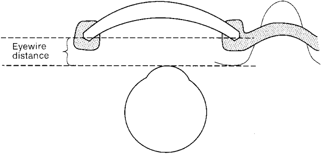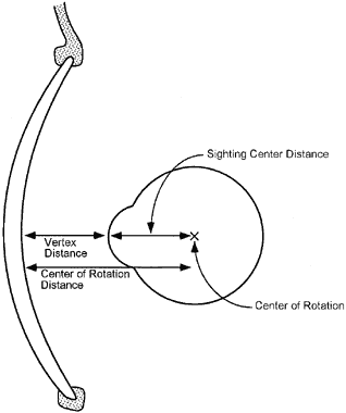 can be calculated from7: (3) transverse chromatic aberration = h × DÞgn where h is the distance of the point from the optical center of the lens in centimeters, D is the lens power in diopters, and Þgn is the Abbe number. Transverse chromatic aberration has units of prism diopters because the term h × D is Prentice's rule, the formula for calculating the amount of prism at any point on a lens. Equation 3 shows that transverse chromatic aberration is larger for lenses of higher powers, for larger viewing angles or larger distances from the lens optical center, and for materials with smaller Abbe numbers, which are primarily the higher index materials. Both theoretical and experimental studies of transverse chromatic aberration suggest that the threshold for its detection is approximately 0.10 prism diopters.8,9 With this information, the lens power at which transverse chromatic aberration should be detectable can be calculated from equation 3. Polycarbonate, a high-index material with an Abbe number of 30, can be used as an example. At a distance of 1.5 cm (approximately 30 degrees) from the optic axis, the threshold of 0.10 prism diopters of transverse chromatic aberration is reached for a lens power of 2.00 D. However, clinical experience suggests that patients usually do not report problems caused by the chromatic aberrations of polycarbonate for lens powers less than approximately 5.00 D. For those patients who do, the problem is usually eliminated with proper choice of base curve. The difference between theory and clinical experience is probably related to the differential effects of transverse chromatic aberration on high- and low-contrast targets. When a high-contrast target is viewed through a lens with transverse chromatic aberration, the color fringes only blur the target in one meridian, with other meridians relatively unaffected. At high contrast, this blur might not be expected to have much effect on visual acuity because the other meridians are still in focus. However, in low-contrast situations, transverse chromatic aberration may be more of a problem because even the unaffected target meridians are difficult to resolve. In other words, transverse chromatic aberration lowers the retinal image contrast in both the high- and low-contrast situations, but the contrast loss in the low-contrast situation may be more critical for visual resolution. The off-axis monochromatic aberrations of a spectacle lens increase as lens power increases, even with the best possible base curve choice. At low powers, the aberrations have little effect on image quality, but the aberrations of higher power lenses may decrease off-axis image contrast enough that the total loss of contrast is significant. Use of the wrong base curve makes the problem even worse. Therefore, a proper base curve selection is of considerable importance for high-power, high-index lenses. Lens designers can make two modifications to standard lens design theory to optimize the base curve selection process for these lenses: (1) the use of smaller steps between base curves, approximately 1.00 D instead of the normal 2.00 D, resulting in more base curves for the available prescription range, with each base curve used for a smaller range of prescriptions, and (2) the use of different base curves for different lens positions on the face. The effects of vertex distance on lens performance are equally as important as the effects of base curve changes. Selection of the base curve of a lens based on the fit of the frame on the patient's face is termed custom design. THE EYEWIRE DISTANCE The distance from the back surface of a spectacle lens to the center of rotation of the eye is the center of rotation distance or stop distance. This distance is the sum of the vertex distance, the distance from the back surface of the lens to the apex of the cornea, and the sighting center distance, the distance from the corneal apex to the center of rotation of the eye (Fig. 3). The center of rotation distance has often been assumed to be a constant during the lens design process.10 However, at least four problems occur with this approach. The obvious one is that there may be considerable variation in stop distances in the general population. Second, the center of rotation distance changes as the base curve of a lens is steepened or flattened in the lens design process. Third, the vertex distance cannot be measured in the optical dispensary when preparing the order for spectacles because the new lenses for the patient's new frame are not yet available. Fourth, if a lens series is said to be designed for a given center of rotation distance, it is difficult for a clinician to relate that distance to the needs of a particular patient. A solution to these problems is to use eyewire distance.