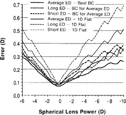 *Eyewire distance range is 7.1–12.1 mm (short). The third row or bottom row associated with each sphere power lists the largest error in diopters at a 30-degree viewing angle for the base curve range. This table may be used for CR-39 plastic, high-index materials up to index 1.60m and for the polycarbonate. The design refractive index was 1.55. Base curves for the lens powers between those listed in the table can be interpolated.