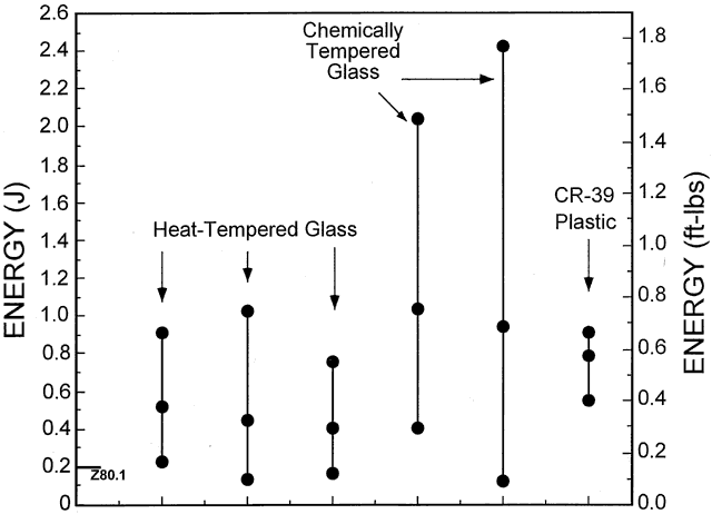 lens drop-ball test.3,15,16 The lens must be able to withstand the impact of a Nonprescription sunglasses also must be impact resistant. Unlike prescription lenses, these lenses, whether glass or plastic, may be batch tested for impact resistance by the manufacturer. The FDA further requires that the lens manufacturer, optical laboratory, ophthalmologist, optometrist, and optician all maintain records of impact resistance testing, copies of invoices, shipping documents, and bills of sale for at least 3 years. It is not necessary to maintain records of those purchasing nonprescription sunglasses or over-the-counter reading glasses at the retail level. The FDA does not have a minimum thickness requirement for ophthalmic lenses. Lenses made from crown glass and CR-39 plastic will not reliably pass the drop-ball test unless they are at least 1.5 to 2 mm thick. Polycarbonate and some of the other high-index plastics can be made with center thicknesses as low as 1 mm in minus powers. Improvements in coating technology also allow thinner plastic lenses. One advance is the so-called primer coat, a rubber-like coating applied under the abrasion-resistant coating of a plastic lens. This coating acts as a shock absorber to disperse the energy of an impact, and it also acts to prevent a crack in the abrasion-resistant coating from propagating throughout the lens. With this technology, it is possible for essentially any minus-power plastic lens to be manufactured with a 1-mm center thickness. SIGNIFICANCE OF THE DROP-BALL TEST The FDA-mandated drop-ball test results in an impact energy of 0.2 joules (J) or 0.15 foot-pounds (ft-lb) on the lens front surface. Many simple accidents and sports missiles result in energies that exceed this value by anywhere from 2 to 100 times. STRENGTHS OF LENS MATERIALS The impact resistance of a lens is a function of the material from which it is made, any special treatment of the material, and the thickness, size, and shape of the lens. In addition, the method of support contributes to the strength of the mounted lens. For dress eyewear prescriptions, the choice of frame is usually made independently of the lens type or material, and the lens thickness is maintained at the allowable minimum. Thus, the variables that affect the impact resistance of a lens are the material and any treatment of the material that may enhance or degrade its impact resistance. Glass Lenses The elementary structural units of glass are not molecules, crystals, or grains but are charged atoms (ions) that are arranged in a random amorphous relationship. The attraction between ions creates bonds that are inherently extremely strong. However, even the slightest imperfection in the surfaces, such as the abrasion caused by rubbing with paper or a small defect caused by rough handling, weakens a brittle material like glass. The abrading techniques used to surface glass spectacle lenses during the manufacturing process create minute flaws that interrupt the bonds near the surface and weaken it. The edging process also creates similar defects. Thus, a glass spectacle lens as it is commonly used has lost much of its inherent strength and requires treatment (tempering) before it can be considered impact resistant. Because the strength of the lens surface is the determining factor in the strength of a glass lens, an obvious way to improve the strength of a lens would be to improve the strength of the surface. The surface has a certain tensile strength, and it is desirable not to put tension on the surface in excess of this strength. If a way could be found to compress the surface, then a force acting on the lens surface would need to overcome this compression before fracturing the lens. This is the mechanism of achieving lens strength for heat and chemical tempering. HEAT TEMPERING. The heat tempering process consists of heating a lens almost to its softening point, then rapidly cooling the lens with jets of air. Heat tempering makes a dress lens approximately two to three times as impact resistant as an untreated lens, but a heat-tempered dress lens is not as impact resistant as a chemically tempered dress lens, nor is it as impact resistant as any other type of dress ophthalmic lens. For this reason, heat tempering cannot be recommended. Heat tempering is still occasionally used for plano (nonprescription) industrial lenses and for some industrial prescription eyewear. One important reason is that a heat-tempered lens can be readily identified. Also, heat tempering works better for thicker industrial lenses than for dress lenses because there is room for a thick compression layer. CHEMICAL TEMPERING. Chemical tempering uses a process of ion exchange to create a compressed surface layer in a lens. Crown glass lenses are immersed in a potassium nitrate bath at 450°C for 16 hours.17 Sodium ions from the glass migrate into the bath, and potassium ions migrate into the glass. The potassium ions are larger than the sodium ions they replace, crowding the ions in the lens surface and compressing it. The compression is much higher and more uniform than that obtained with heat tempering, resulting in greater impact resistance.18 Chemical tempering is the preferred method of treatment for dress glass lenses. Glass photochromic lenses are chemically tempered by immersion for 16 hours in a bath that is a mixture of potassium nitrate and sodium nitrate at 400°C.17 A 2-hour chemical tempering process that uses a potassium nitrate bath is also available, but this process can only be used for dress photochromic lenses.19 The compression developed at the surfaces of a chemically tempered lens is higher than that for a heat-tempered lens, but the compression layer is thinner.20 A flaw or scratch that penetrates the compression zone severely weakens a lens,21,22 so the impact resistance of a chemically tempered lens is more vulnerable to compromise from a deep scratch. IMPORTANCE OF GOOD LABORATORY PRACTICE. The process 