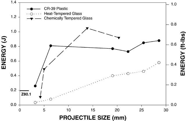 One of us (Davis) has been involved in litigation as an expert witness in many nonsport situations. For example, eye injuries have resulted from playfully tossed crab apples, plastic drinking glasses, and a fist in a bar doorway. An eye injury may have been caused by a tossed magazine. In automobile accidents, eye injuries result from broken spectacles and sunglasses, and some eye injuries have been caused by spectacles broken during airbag inflation.38 Many injuries result from falls and collisions with objects. The impact energies in most of these cases are far beyond what is needed to break CR-39 plastic and crown glass. The minimum energy in foot-pounds at the receiving end of a thrown object is equal to the weight of the object in pounds multiplied by the distance in feet it is thrown divided by 2. A typical magazine weighing 12 ounces thrown 6 feet provides an impact energy of 2.25 ft-lb, or 3 J. This is 15 times the impact energy of the drop-ball test, easily enough to break CR-39 plastic or crown glass, but not 2-mm thick polycarbonate. Because of the wide variety of projectile sizes and velocities associated with broken spectacle lenses and eye injuries, crown glass and CR-39 plastic cannot provide reliable protection against all objects. Only polycarbonate can resist the high-impact energies of both large and small objects. Whenever eye protection is a concern, for example, for industrial workers, for athletes, for children, and for monocular or amblyopic patients, only polycarbonate plastic provides adequate protection. In fact, one should have a reason when polycarbonate is not prescribed in these situations. EYE PROTECTION IN INDUSTRY The US Occupational Safety and Health Administration (OSHA) requires that all industrial eye and face protectors meet the requirements of ANSI Z87.1-1989—American National Standard Practice for Occupational and Educational Eye and Face Protection.39–41 Protectors covered by the standard include goggles, face shields, welding helmets, and both prescription and nonprescription spectacles. A discussion of the requirements for prescription eyewear follows. For spectacles to be considered protective in industry, both the lenses and the frame must meet the ANSI Z87.1 standard. Industrial lenses in a dress frame or dress ophthalmic lenses in an industrial frame do not meet the standard and should never be prescribed or dispensed. The following summarizes the current requirements for industrial prescription spectacle lenses: