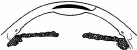 Many other non-Placido disc systems have been used for corneal topography analysis. The most commonly used today (Orbscan, Bausch & Lomb, Rochester, NY) is based on analysis of multiple Scheimpflug slit images of the cornea. Anterior corneal elevation, corneal thickness, and posterior corneal shape can be determined. LAMELLAR REFRACTIVE KERATOPLASTY PROCEDURES Refractive keratoplasty can be divided into lamellar procedures and nonlamellar procedures. Nonlamellar procedures alter corneal curvature without the addition or removal of tissue. Radial keratotomy and various types of incisional surgery for astigmatism are the most common nonlamellar procedures. Lamellar procedures involve the removal of tissue from the cornea or the addition of tissue or synthetic material to change its refractive power. Most lamellar procedures change the refractive power by altering the anterior corneal curvature, which can be accomplished in several ways. A tissue or hydrogel lens can be placed within the corneal stroma (keratophakia and intrastromal hydrogel lens implantation); a tissue lens can be placed on the anterior corneal surface (epikeratophakia); the anterior lamellae of the cornea can be removed, shaped, and replaced (keratomileusis); or the excimer laser can be used to remove corneal stroma, either on the surface or within the stroma. In one lamellar procedure (intrastromal polysulfone lens implantation), a synthetic lens with a high refractive index was placed within the cornea and changed the refractive properties of the cornea without altering the anterior corneal curvature. Each of these procedures is briefly described in the following sections. KERATOPHAKIA AND INTRASTROMAL LENS IMPLANTATION Modern lamellar refractive keratoplasty originated with Jose I. Barraquer's work in Colombia, South America. In 1949, Barraquer developed keratophakia for the correction of aphakia because of the dissatisfaction with aphakic spectacles and the contact lenses and intraocular lenses that were available at that time. His results were first reported in 1963,5 and the procedure was introduced in the United States in 1977.6 Attempts to adapt Barraquer's classic form of keratophakia for the correction of myopia have not been successful. In keratophakia, a plus-powered tissue lens of donor corneal stroma is implanted intrastromally into the patient's cornea (Fig. 3). The portion of the patient's cornea that overlies the implanted tissue lens conforms to the anterior surface of the tissue lens, and the anterior corneal curvature steepens.