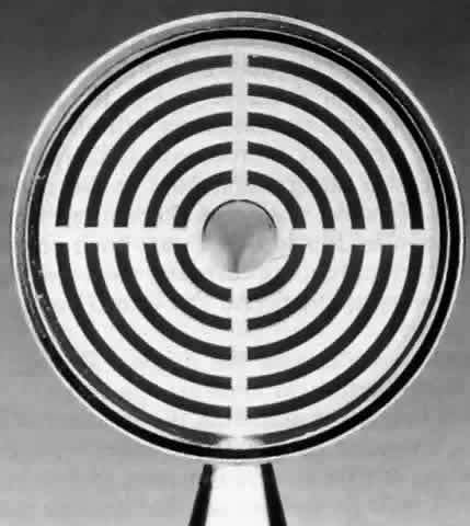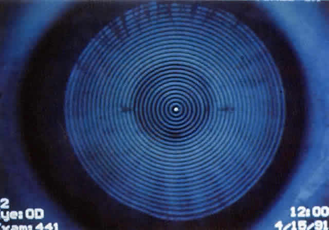 of corneal shape. The first known keratoscope target was the image of a window, as reported by Scheiner in 1619 using natural light. He estimated the corneal curvature by comparing the window pane corneal reflection to those of a series of marbles until he found one that gave an image the same size as that of the cornea.1 In 1820 Cuignet developed a keratoscope through which he observed the reflected image of an illuminated target held in front of a patient's cornea. His major problem was in the alignment of the light, target, and observer with the patient's visual axis. This was overcome in 1882 by Placido, who placed an observation hole in the center of the target.2 Placido's target of alternating black and white rings (the Placido disk) has been embodied in many devices that are currently used to measure corneal topography, hence the term Placido disk keratoscopy. A modern version of the original Placido disk is the Klein hand-held keratoscope (Fig. 1). This device is useful for detecting the location of tight sutures, irregular astigmatism, and keratoconus, all of which can be detected by mire pattern recognition. Its main limitations are that its mire pattern has an outer diameter of 5.5 mm, limiting its utility for evaluating peripheral topography. In addition there is no mechanism to achieve alignment other than user estimation, which introduces significant error in subjective interpretation.1 Photokeratoscopes (e.g., Corneascope: Keravision, Santa Clara, CA) project a series of concentric circular mires that form a virtual image located within the anterior chamber of the eye. Information regarding the power of the anterior corneal surfaces is derived from visual inspection of the size and shape of the mires.