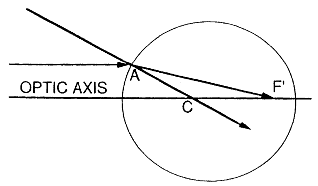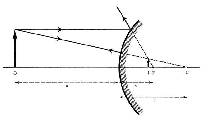 CALCULATION OF CORNEAL SURFACE POWER Videokeratoscopic analysis of corneal shape relies on the optical principal that the tear film on the anterior corneal surface acts as a convex mirror. A light (mire) shined toward the cornea gives rise to a virtually erect image located approximately 4 mm posterior to the anterior surface of the cornea, at the level of the anterior lens capsule. This is the corneal light reflex, or first Purkinje-Sanson's image, which is viewed during both keratoscopy and keratometry. The size of this image can be used to quantify the curvature of the cornea: the steeper the cornea (i.e., the smaller the radius of curvature), the more powerful the convex mirror it is, and the smaller the image will be. By the same principles, any toricity (different radii of curvature in different meridians) or irregularity of the corneal surface will cause a regular or irregular distortion of the image.2 The image formed by a convex mirror can be constructed using two rays: (1) a ray parallel to the principal axis, which is reflected away from the principal focus; and (2) a ray from the top of the object traveling toward the center of curvature and reflecting back along the same path (Fig. 7). The magnification produced by a curved mirror is the ratio of the image size (I) to the object size (O); this, in turn, is proportional to the ratio of the distances of the image (v) and the object (u) from the mirror, as follows: