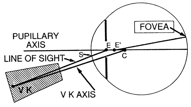 Alignment Currently videokeratoscopes are aligned along an axis that is neither the line of sight nor the visual axis, both of which could be practical reference points. The subject looks at a fixation point on the optic axis of the instrument. The videokerato-scopic axis is aligned perpendicular to the cornea and thus is directed toward the center of curvature of the cornea for some unknown peripheral position (Fig. 9).11