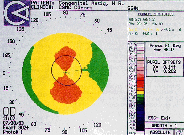 The degree of flattening may vary from 1 to 4 diopters. There is significant variability in the shape of videokeratographs of normal eyes, with 5 to 10 classifiable shapes proposed depending on which scale is used.18,19 The same normal cornea may also look different if printed in the normalized scale as opposed to the absolute scale. To get an appreciation of normal shape, it is recommended that one scale, the absolute scale, be consistently used initially for diagnostic purposes. In this scale, the color red (range, 49 to 50.5 diopters) is almost never seen in the normal cornea.19–21 Though there are interindividual differences in corneal shape, the corneal surface shapes of the companion eye in a single patient are often strikingly similar. ASTIGMATISM Regular Regular astigmatism is either congenital or surgically induced and is depicted as a figure-eight pattern (Fig. 11), with the two lobes being almost equal in size. Regular astigmatism may be with the rule (figure eight at 90°), against the rule (figure eight at 180°), or oblique (figure eight at an oblique axis).1