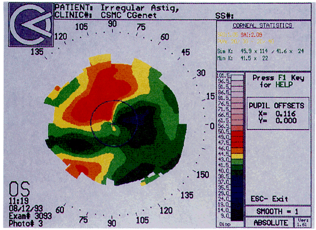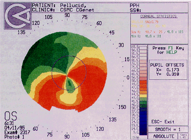 Causes of irregular astigmatism are multiple and may include tear film abnormalities, as is seen in patients with keratitis sicca or severe meibomitis, the latter of which is depicted on videokeratography as absent areas of digitization and irregular or defocused keratoscopic rings. Epithelial abnormalities are another source of irregular astigmatism and may be caused by diseases such as infectious keratitis, toxic epitheliopathies, map-dot-fingerprint dystrophy, Reis-Bucklers' dystrophy, and lattice dystrophy. The topographic alterations are commonly the result of focal elevations of the epithelium over dystrophic tissue or subepithelial scarring from previous epithelial erosions. If the irregular astigmatism is the sole source of the patient's decreased vision, the acuity should improve with a rigid contact lens overrefraction, since the lens provides a smooth anterior refracting surface that neutralizes the surface irregularity. Other causes of irregular astigmatism include inflammatory processes affecting the stroma, trauma, peripheral limbal masses (e.g., limbal dermoids), and pterygia, all of which can cause significant reduction in visual acuity. In these cases, the cornea may appear normal on clinical examination, whereas videokeratography reveals typical and obvious topographic alterations.1,16 KERATOCONUS The corneal topography of keratoconus is highly complex and extremely variable, the cone taking many different shapes and the apex being located at variable points relative to the center of the cornea. Before the introduction of computer-assisted videokeratography, cones were described as having two basic shapes: oval and nipple-type. These could easily be differentiated with slit-lamp microscopy and the nine-ring photokeratoscope. Videokeratography has demonstrated that corneal shape is more complex than previously described.22–24 Classically, keratoconus is depicted as a localized area of increased surface power surrounded by concentric zones of decreased surface power (Fig. 13). The area of steepening may occur anywhere on the cornea. Inferior steepening, more prominent temporally, is the most common pattern seen. Other complex patterns, such as central steepening with a superimposed asymmetric bow-tie pattern are also noted. Videokeratography is useful in distinguishing keratoconus from other thinning disorders, such as pellucid marginal degeneration and Terrien's marginal degeneration. In pellucid marginal de-generation, videokeratographs have a butterfly-shaped pattern, demonstrating low corneal power along the central vertical axis, increased power as the inferior peripheral cornea is approached, and high corneal power in the midperipheral cornea along the inferior oblique meridians25 (Fig. 14). In Terriens' marginal degeneration, there may be a variety of patterns depending on areas of involvement; however, located superiorly, it will have an inverted butterfly-shaped appearance (i.e., the wings of the butterfly flipped upward and pointing superiorly).26