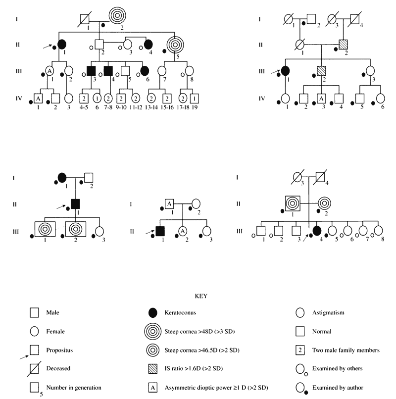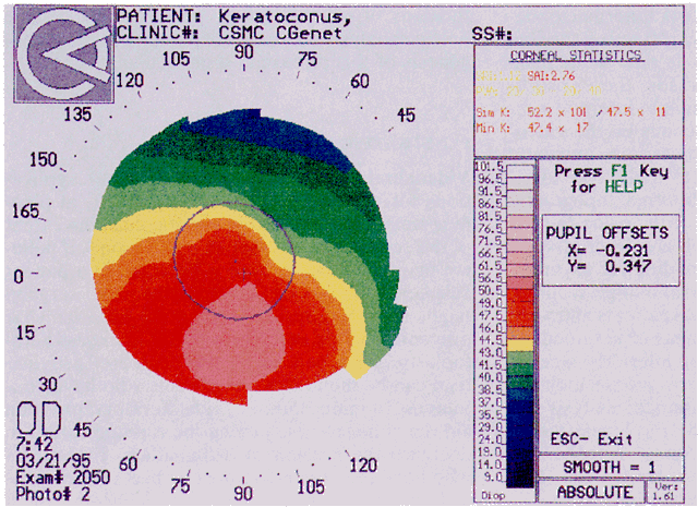 Videokeratography studies have provided evidence to suggest a genetic basis for keratoconus. In one study,31 we found that 50% of family members of patients with keratoconus had subtle topographic findings similar to that seen in clinically obvious keratoconus. In a subsequent study,32 using videokeratography as an aid to construct family pedigrees, we demonstrated an autosomal-dominant mode of heredity (Fig. 16). Future investigations of suitable family pedigrees for genetic linkage analysis may provide pointers to the pathogenesis of this disease at a molecular level.32 PENETRATING KERATOPLASTY Videokeratography has several clinical applications for penetrating keratoplasty. First, in planning surgical treatment for keratoconus, the extent of the ectasia can be mapped out. Second, if pellucid marginal degeneration is detected in a patient suspected of having keratoconus, the surgeon might want to consider embarking on a lamellar procedure before considering a full-thickness keratoplasty. Postoperatively, the degree of astigmatism can be monitored. In patients who have continuous running sutures, videokeratography can aid the clinician in adjusting the running suture to decrease the amount of astigmatism. In patients who have interrupted sutures as part of their procedure, videokeratography can delineate which sutures are tight and should be removed during selective suture removal.33–35 Finally, videokeratographs can assist the surgeon in planning for astigmatic keratotomy in patients who have large degrees of postpenetrating keratoplasty astigmatism. Whereas keratometry might suggest that T cuts should be placed 180° apart, videokeratography often demonstrates that the steep axes are nonorthogonal, influencing the surgeon to place the T cuts in the steepest areas, which might be separated by angles of less than 180°. A recent study of patients with postpenetrating keratoplasty astigmatism showed that the results of astigmatic keratotomy combined with compression sutures using videokeratography as a guide are superior to the results of studies in which either keratometry or photokeratoscopy alone were used as a guide.36 RADIAL KERATOTOMY Videokeratography in radial keratotomy has gained increased utility in the following areas: screening before surgery, planning for surgery, monitoring corneal changes after surgery, explaining untoward effects of surgery, and managing complications.37–41 As previously discussed, preoperative screening of candidates for radial keratotomy is useful to rule out early forms of corneal ectasia not detectable by clinical means and also holds promise for predicting the outcome of surgery based on corneal shape. Previous studies suggest that corneal shape might be a predictor of the response to radial keratotomy. Videokeratography is extremely useful for planning astigmatic surgery in conjunction with radial keratotomy. The topographic pattern is useful for deciding the placement and length of the astigmatic cuts; the pattern and location of the astigmatism may also dictate the orientation of the radial cuts. Color-coded maps might also be useful in planning repeat surgery in patients with a response to surgery that has been less than optimal. A wire mesh profile in the new Topographic Modeling System software demonstrates the location and depth of the cuts. Cuts that have not been made deep enough for maximal effect can be identified and redeepened for additional effect (Fig. 17).