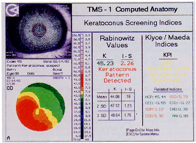 One of the most useful applications of computer-assisted videokeratography is the detection of keratoconus before the onset of slit-lamp findings or retroillumination techniques. Even in the presence of regular keratoscopy mires, there may be subtle signs of keratoconus as displayed by the color-coded videokeratographs. In most instances the topographic findings in these eyes are similar but more subtle than those in advanced disease; even in these early stages of keratoconus there may be significant variation in the topography of the cornea. Because it is important to detect abnormal topography before embarking on any refractive surgical procedure, videokeratography is now being used routinely to screen patients for these procedures.27,28 Since it may be difficult to interpret subtle changes resembling keratoconus on the videokeratograph, quantitative indices are currently being developed by Rabinowitz29 and Klyce to assist the clinician in detecting abnormal topography on an automated basis.30 The Rabinowitz indices Central K and I-S value, which are descriptive of central steepening and inferior dioptric asymmetry, were derived from a study of a large group of normal subjects and keratoconus patients and were based on the fact that the corneas of keratoconus patients are either centrally or inferiorly steeper than normal corneas. The Klyce system looks at multiple indices and uses discriminant analysis and a classification tree to describe the likeness of a videokeratograph to keratoconus videokeratographs, which is expressed as a percentage (Fig. 15).29 Work is in progress to refine both systems.