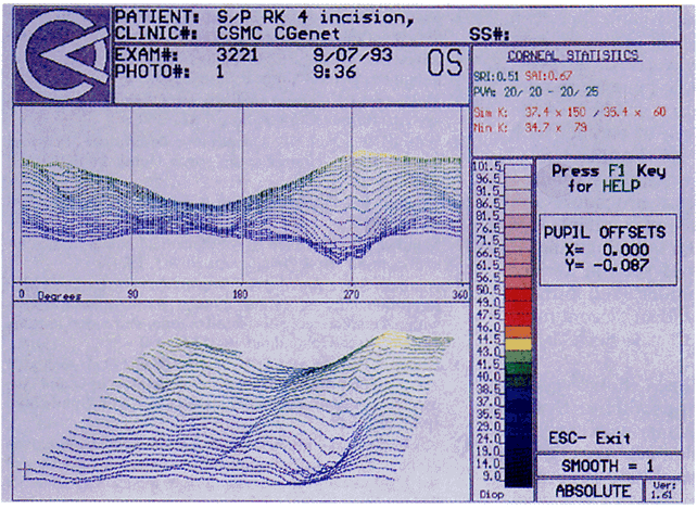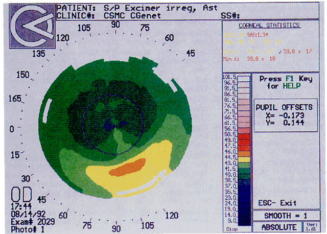 EXCIMER LASER PHOTOREFRACTIVE KERATECTOMY When excimer laser photorefractive keratectomy becomes approved in the United States, it will be essential for the clinicians performing these procedures to have a thorough understanding of videokeratography. Videokeratography is not only essential for screening candidates for these procedures, but it also provides important information regarding the quality of the ablation zone, the diameter of the ablated zone, centration of the ablation, and the stability of the topographic alterations. In addition, irregularity and multifocality within the ablation zone can be determined. Decentration of the ablation zone, as determined by videokeratography, might explain postoperative halo or glare effect. Irregular ablation zones (as is seen in “central islands”) often explain decreased acuity and decreased quality of vision after these procedures (Fig. 18). Recognition of these abnormal zones has resulted in modification of the procedure to prevent their occurrence.42–46