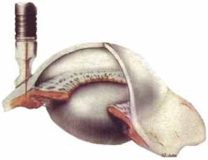 created with other surgical techniques. One group of these procedures were ab interno laser sclerostomies that attempted to create an opening from the anterior chamber into the subconjunctival space by pulsing laser energy through the cornea using a special gonioscopy lens and focusing on the angle. While some limited success was reported, these procedures have not withstood the test of time and are not presently being utilized.9 Similarly, techniques were developed using endoprobes that were placed across the anterior chamber and used to create sclerostomies by opening channels from the anterior chamber to the subconjunctival space. Again, the advantages or benefits of these procedures have not been sufficient and these techniques have been largely abandoned. A second group of procedures used external probes that were introduced into the subconjunctival space, advanced to the limbus and then used to create a channel through the sclera into the anterior chamber. The most extensive experience with this technology utilized a homium laser.10 For a while, the technique was used fairly extensively. Unfortunately, the high rate of iris plugging of the sclerostomy and other complications also has led to this technique largely being abandoned. |