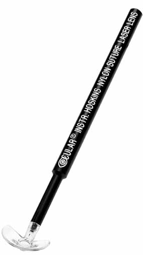 With the widespread use of antimetabolites such as 5-fluorouracil and mitomycin C as adjuncts to glaucoma filtering surgery, there has been a trend toward closing the scleral flap more tightly than was the case previously. Then during the first few days or weeks after the surgery, the scleral flap sutures are released one by one in an attempt to titrate the amount of filtration. Laser suture lysis is one of the popular methods of achieving this.23 Several special lenses have been designed to help facilitate this procedure (Fig. 2). The lenses help keep the upper lid out of the way, compress and blanch the overlying conjunctiva, and focus the laser energy on the suture. Most commonly, argon lasers are used for this procedure. The laser is set at approximately 500 mW for 0.05 seconds and a 100-μm spot is used. The laser must be focused carefully because if the focal plane is too anterior, it can burn a hole in the conjunctiva causing a bleb leak. If there is subconjunctival hemorrhage or excessive Tenon's capsule as is seen in some African American patients, it may not be possible to visualize the sutures sufficiently to perform this procedure. |