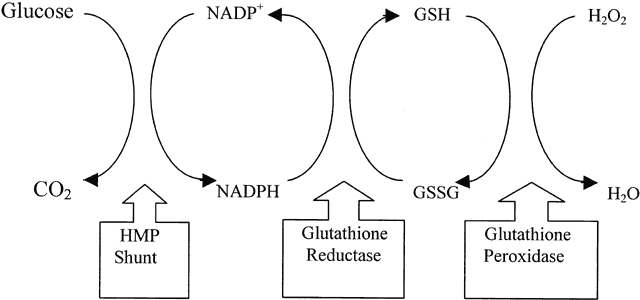 The long-recognized association of GSH loss with cataract and the marked increase in protein disulfide formation leading to aggregation and insolubilization of proteins in many cataracts points to the thiol redox balance as perhaps the most important factor in the ability of the lens to protect itself from oxidative damage. Under conditions of oxidative stress, GSH levels decrease but levels of the oxidized disulfide GSSG and mixed disulfides of GSH with protein sulfhydryls increase. These oxidations can be catalytically reversed by the activities of glutathione reductase, an NADPH-dependent enzyme that converts GSSG back to GSH, and thioltransferase, which reduces protein mixed disulfides. Thioltrans-ferase, which has only recently been characterized from lens,26 uses GSH as cofactor. Thus, GSH and the GSH redox cycle appear to be the central elements in lens antioxidant defenses. |