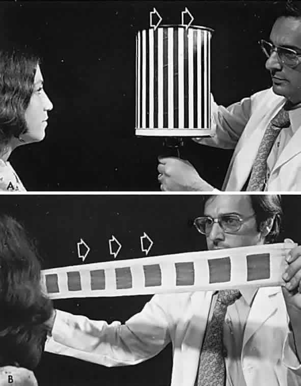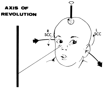 Vertical conjugate gaze is somewhat more difficult to assess. Downward gaze should be at least 45°, but since the lower lid is indented by the cornea, there is no constant landmark. Upward gaze is even more difficult to assess. Chamberlain1 reported a progressive restriction in upward ocular versions with advancing age: 95 patients aged 5 to 34 years had 36° to 40° of elevation; 125 patients aged 65 to 94 years had 16° to 22° of elevation. Conjugate versions may also be tested without the patient's active cooperation, by directing attention to a distant target (e.g., a wall-mounted light, or even while an acuity chart is being read), and passively rotating the patient's face to the right, left, up, and down. Convergence Convergence is an associated, but disjugate, movement, in that the eyes move toward each other, rather than turning toward the same side (i.e., conjugate). It is usually accomplished by synchronous action of both medial recti muscles as in reading or other near-visual tasks, but convergence may be blended with a conjugate gaze, for example, fixating a near object directly in front of one eye. The neural mechanisms responsible for adduction during lateral conjugate gaze, and during convergence, are separate and may be dissociated in pathologic states, for example, in patients with internuclear ophthalmoplegia. It is helpful to test convergence capability in the following neuro-ophthalmologic situations: (1) if pupillary light reactions are absent or sluggish, the pupils are observed during convergence (more precisely, during the near-effort reflex); (2) if there is lag of the adducting eye on lateral conjugate gaze suggesting an internuclear ophthalmoplegia; (3) any bilateral external ophthalmoplegia; and (4) in acquired exotropia, in which monocular ductions are full, suggesting convergence paralysis. Convergence strength varies considerably and depends principally on the cooperation of the patient. A sure sign that the patient is indeed attempting to converge is simultaneous pupillary constriction. Of course, there are pathologic states that involve both convergence and pupillary constriction (e.g., Parinaud's dorsal midbrain syndrome). It is helpful if the patient's own finger is used as a convergence target. Thus, even in a blind patient, convergence may be examined using proprioceptive clues to the nearness of one's finger or hand. Reticence to attempt to gaze at one's finger, or histrionic avoidance, may signal a functional disorder or dissembling. SPECIAL TECHNIQUES Examination of Infants In order to determine the extent of conjugate eye movements in infants, it is often necessary to resort to special clinical techniques and manipulations. However, initial observation of spontaneous versions and fixation may suffice, and such observations should begin before the infant or young child is startled or anxious. Otherwise, visually elicited eye movements are provoked by objects that attract an infant's attention (see Volume 2, Chapter 2, Fig. 9) and therefore also provide a gross estimation of visual function. Similarly, a child turns head and eyes toward a sound (jingling keys). This is an acoustically elicited eye movement that does not require sight, however, and so no conclusions may be drawn regarding vision. If the child accurately fixates and follows any silent object, that is good evidence of reasonably intact vision. If the examiner holds a neonate upright, face to face, and turns, the neonate's eyes undergo a tonic deviation in the direction of the turn (Fig. 2). This tonic, conjugate eye deviation is a result of labyrinthine stimulation and does not depend on vision. The fast phase (jerk) of such rotation induced nystagmus may be absent in the premature neonate, but it is usually present before 1 week of age. Rotational maneuvers are helpful in determining the state of brain stem systems for conjugate horizontal gaze. Failure to elicit eye movement on rotational testing infers a major pontine or extraocular muscle abnormality. Brisk rotation of the head, vertically and horizontally, on the long axis of the body (“doll's head” phenomenon), produces tonic contralateral horizontal deviation of the eyes in the neonate. Optokinetic nystagmus (OKN; see below) may be used to determine ocular motility, but induced OKN movements are less extensive than with rotational stimulation. Disparity between vertical and horizontal response or between optokinetic and rotational responses may indicate a disorder of supranculear gaze mechanisms, such as in congenital ocular motor apraxia or congenital nystagmus (see Volume 2, Chapter 13). Optokinetic Nystagmus If a series of vertical bars or other such patterned contours is passed before the eyes (Fig. 3), a visually induced nystagmus occurs. This nystagmus was apparently first adequately described by Helmholtz, who observed the eyes of passengers gazing out of train windows at the passing countryside. This phenomenon is easily noted in riders of subway trains, buses, and so forth. There is a slow following phase toward the side of target movement (or at the passing scene) and a rapid jerk return in the opposite direction. The character of OKN is partially dependent on the speed of target movement, the pattern density, and the subject's visual function and state of attentiveness. Because the slow phase is initiated by vision, OKN may be used as a rough parameter of visual function. As noted by Linksz,2 OKN is more closely related to movement perception or contour recognition than to visual acuity. Actually, suppression of OKN response by interposition of a fixation target of variable size is best correlated with “acuity.” It should be recognized that OKN represents an innate and highly complex ocular motor reflex evoked by perception of moving contours, which is only distantly related to visual acuity. In clinical practice, only a rough estimate of visual “acuity” is obtained with the usual optokinetic devices. Ex