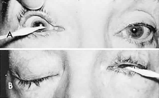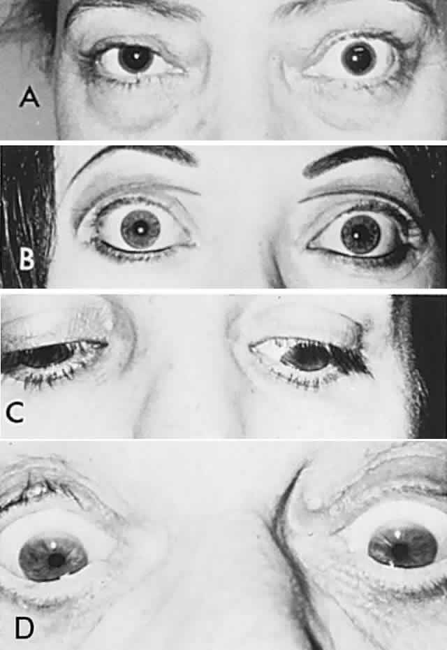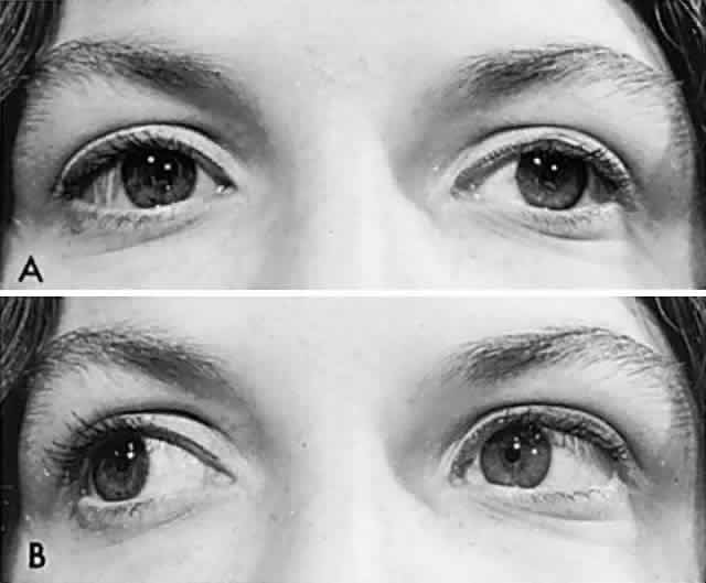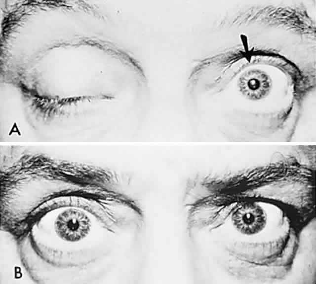 Lid retraction may be seen with congenital anomalous synkineses, of which the Marcus Gunn jaw-winking phenomenon (Fig. 14A) is most widely known (see Volume 2, Chapter 13). Other congenital anomalous patterns are occasionally seen, such as lid retraction on downward gaze (Fig. 14B,C). The relationship of such anomalous synkineses with aberrant regeneration (misdirection) in the third cranial nerve is tenuous, because preceding oculomotor palsies have not been documented, and embryopathic miswiring is a more likely mechanism. Bartley26 has suggested that lid retraction may be roughly classified as “neurogenic, myogenic and mechanistic”; this author also includes an extensive catalog of miscellaneous disorders purported to be associated with eyelid retraction. PTOSIS The causes of lid ptosis are numerous, as outlined below, and the most common are discussed in sections dealing with the primary disorder (e.g., myasthenia, Horner's syndrome, oculomotor nerve palsies):