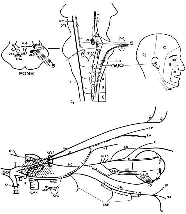 The nonocular distribution of the ophthalmic division is of major clinical importance because disturbances of intracranial structures, including dura, dural venous sinuses, cerebral arteries and veins, all typically refer pain to the eye, orbit, or brow. Referral of pain from dural stimulation was reviewed by Wirth and van Buren,36 who found that pain patterns secondary to intracranial disease were not sufficiently specific to provide precise clinical localization. Peripheral Trigeminal Afferents The trigeminal nerve conveys pain and mechanoreceptor afferents from the intracranial dura, except the infratentorial dura of the posterior fossa, from which afferents are carried by the vagus. There are vagal somatosensory afferent fibers that run in the spinal tract of the trigeminal and synapse with cells in the spinal nucleus; although the vagus is the peripheral nerve, the central connections are essentially trigeminal. Cell bodies for the peripheral trigeminal fibers and for the primary nociceptive and other afferents are situated in the gasserian ganglion in Meckel's cave at the base of the sphenoid bone (see Volume 2, Chapter 12, Figs. 5 and 20). Cells here vary in size; the smaller (C-nociceptors) synapse in the caudal end of the spinal nucleus, which is consonant with clinical evidence that pain results mainly from lesions in the caudalmost part of the spinal nucleus and tract. In addition, there is layering of the inputs in the spinal tract: the ophthalmic fibers that terminate caudally are ventral; the maxillary division fibers end in a more dorsal and rostral layer; and the mandibular division fibers insert above the maxillary layer. Dorsal to three trigeminal layers in the spinal nucleus are pathways served peripherally by cranial nerves IX, X, and the facial intermedius (VIIi). Trigeminal Sensory Nuclei The spinal nucleus is an area of sensory integration, as evidenced by the presence of ascending spinal cord afferents37 and descending fibers primarily from contralateral somatosensory cortex, but also with inputs from the red nucleus, the reticular formation, and of course the primary trigeminal afferents. The spinal tract and nucleus descend to the level of C2 to C4 and merge with the dorsal horn of the spinal gray matter. In fact, the histologic organization of the trigeminal spinal tract pars caudalis is strikingly similar to that of the dorsal horn. There are three layers: an outer marginal zone occupied by large Waldeyer-type cells; a gelatinous layer; and a deeper subnucleus magnocellularis. In the more rostral parts of the spinal nucleus (the interpolaris and the rostralis subnuclei), the histologic organization differs from the caudalis portion. This suggests functional specialization even within the spinal tract, in which the caudalis part is homologous to the dorsal horn pain-carrying system, and the oralis subnucleus is homologous with the nuclei of the dorsal columns, carrying non-nociceptive touch and mechanoreceptor sensation. Trigeminal Ascending Pathways Afferents from the main sensory nucleus travel in the contralateral medial-dorsal portion of the medial lemniscus (trigeminal lemniscus) to the ventral postero-median nucleus of the thalamus. A smaller uncrossed output from the dorsal part of the main sensory nucleus ascends to the dorsomedial part of the ipsilateral ventral postero-median nucleus. Outflow from the pars caudalis of the spinal nucleus probably runs or originates in the reticular formation. Horseradish peroxidase injections into the thalamus have revealed labeled cells in the reticular formation adjacent to the pars caudalis, as well as labeled units in the marginal zone of the spinal nucleus itself.38 This situation suggests a certain similarity with the dorsal horn output, some of which goes directly to the thalamus in the spinothalamic tract, and some goes indirectly via spinoreticular and spinomesencephalic tracts. The caudal spinal trigeminal nucleus input to the thalamus is scanty, according to many of the anatomic studies. Perhaps available methods underestimate these afferents, there being possibly a greater number of polysynaptic neural chains rather than direct monosynaptic inputs from the caudal spinal nucleus. Moreover, physiologic studies indicate that units in the main sensory nucleus, in addition to caudalis spinal nucleus units, respond to tooth-pulp stimulation. Thus, there appears to be duality of nociceptive input, with ascending and descending collaterals from fibers entering via the trigeminal sensory root innervating both the main sensory and the spinal nuclei. CLINICAL EVALUATION OF TRIGEMINAL FUNCTION Sensory testing of the globe and face may be accomplished rapidly and without need for special equipment. Corneal sensation obviously cannot be adequately evaluated after instillation of topical anesthetics for intra-ocular tension measurements. In clinical practice, pain sensation is routinely assessed rather than other sensory modalities. In the otherwise intact patient, both subjective and objective responses may be evaluated. In the lethargic or obtunded patient, blink reflex and head withdrawal are gross objective signs of corneal sensitivity. In office practice, an applicator with a cotton tip drawn to a point (Fig. 18) may be lightly touched to, or drawn across, the inferior aspect of the cornea. In ocular inflammatory disease, the same cotton probably should not be used in both eyes (e.g., with herpes simplex keratitis). The applicator cotton wisp may also be used to test light touch sensation of the brow and face, looking for differences from one side of the midline to the other. Such cutaneous sensory testing is best accomplished with the patient's eyes closed, the response indicating which side of the face has been touched. Subjective and objective responses to eye drop instillation are useful indications of relative corneal sensation. The motor function of the mandibular division is conveniently tested by palpating ma