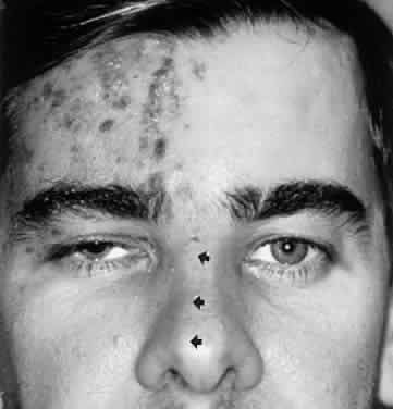 Herpes zoster (from the Greek herpein, to spread, and zoster, girdle or zone) ophthalmicus is a common cause of first trigeminal division acute pain and more-or-less simultaneous or slightly delayed cutaneous vesiculation (Fig. 19), followed by pustule formation. The infection occurs in otherwise healthy persons, but with increasing frequency in immunocompromised patients, including those with malignancies and especially in acquired immunodeficiency syndrome.43 After primary varicella infection (chickenpox), the virus lies dormant in the sensory trigeminal ganglion, until the virus is reactivated as zoster. An inflamed eye with dendritiform keratopathy and iritis is frequent, but it is the disabling post-herpetic neuralgia that constitutes the major challenge in pain control. The risk of post-herpetic neuralgia increases with age. Corticosteroids by systemic administration and antiviral agents such as oral or intravenous acyclovir or famciclovir are reported to ameliorate acute pain significantly and arguably to reduce the likelihood of neuralgia.44 Zoster of the geniculate ganglion, the Ramsay Hunt syndrome, results in ear and facial vesiculation, pain, and facial palsy (see Volume 2, Chapter 8, Fig. 10), as discussed in Volume 2, Chapter 8. Abducens, trochlear, and oculomotor nerve palsies are reported, as well as Horner's syndrome and optic neuritis.45 Trigeminal neuralgia is characterized by episodic, recurring electric shock-like or lancinating (knife-like) pain of severe magnitude, often triggered by stimulation of facial cutaneous areas or mucous membranes of the oral cavity. Usually of idiopathic origin, trigeminal neuralgia also occurs in patients with tumors or vascular compression at the trigeminal root exit zone,46 and infrequently in patients with multiple sclerosis.47 Trigeminal neuropathy implies prominent sensory loss, in which case an infiltrative, inflammatory, or compressive cause must be explored.48 Cutaneous carcinomas of the face, and some nasopharyngeal carcinomas, may present with facial dysesthesias (“ants crawling,” formication), pain, or numbness, at times associated with facial nerve palsies or unilateral ophthalmoplegia. Centripetal perineural spread may eventually carry the disease to the cavernous sinus. Magnetic resonance imaging can disclose involved peripheral trigeminal nerve branches, for example, the infraorbital nerve, that may be biopsied.49 A past history of treatment for facial carcinoma, especially squamous cell, is highly suggestive of this diagnosis. |