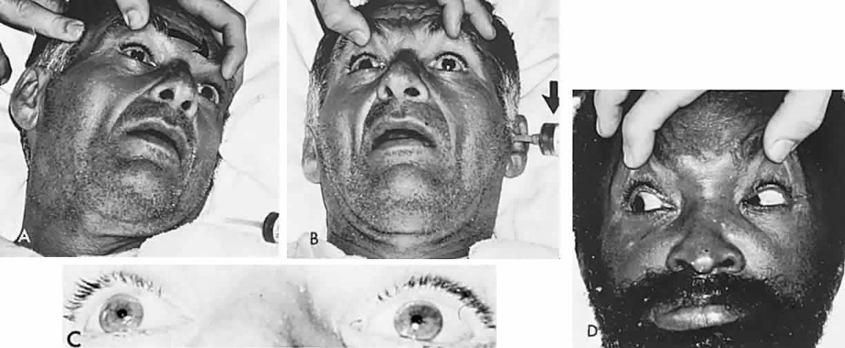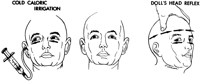 In patients with cerebral and brain stem hemorrhages or increased intracranial pressure, one may argue against the advisability of maneuvers entailing rapid displacement of the head, and certainly such abrupt rotations are contraindicated in cervical injuries. By contrast, as Rodriguez-Barrios52 pointed out, caloric stimulation of the labyrinth is a harmless, simple procedure that may be repeated at will. Caloric irrigation of the ear canal cannot be carried out on the side of an otorrhagia from basal skull fracture, and this complication should first be excluded by otologic examination. The technique of caloric testing may be simplified for bedside diagnosis by using available sources, either cool tap water or ice water. The external canal and tympanum should first be inspected, and wax or other debris should be removed. With the patient's head on a pillow, that is, at an angle of 30° with the horizontal (for maximum stimulation of the horizontal semicircular canals), 10 ml to 20 ml of cold water is flushed into the ear canal using a small rubber tube fitted onto a syringe (see Fig. 20; Fig. 21B). One of several responses may be observed: (1) a slow tonic ocular deviation toward the side of cold irrigation (a bilateral positive response indicates integrity of pontine oculogyric mechanisms); (2) nystagmus, with the jerk phase directed away from the side of cold irrigation (usually the eyes drift toward the side of irrigation, but the nystagmus beats toward the opposite side); (3) no deviation elicited (total abolition of responses to caloric labyrinthine stimulation usually corresponds to an extensive pontine lesion); (4) vertical responses preserved in the absence of horizontal movement, indicating relative sparing of the midbrain (upward deviation is tested by bilateral irrigation with warm water, and downward tonic deviation attempted by bilateral cold water instillation); and (5) an ocular motor nerve palsy (III or VI) further elucidated by observing one eye responding while the other does not, an internuclear ophthalmoplegia may be uncovered. In barbiturate intoxication with coma, all oculocephalic and vestibulo-ocular reflexes may be temporarily lost (see Fig 21). Similar cases with phenytoin alone or in combination with primidone have been reported.53 Table 2 provides an overview of ocular signs in the comatose patient. A complete discussion of neurologic signs in coma is available in the text by Plum and Posner.54