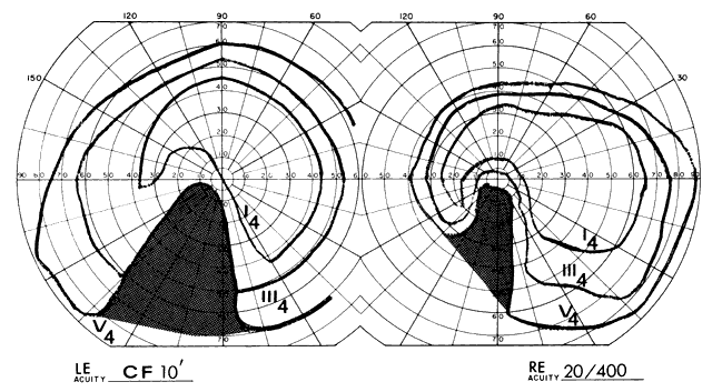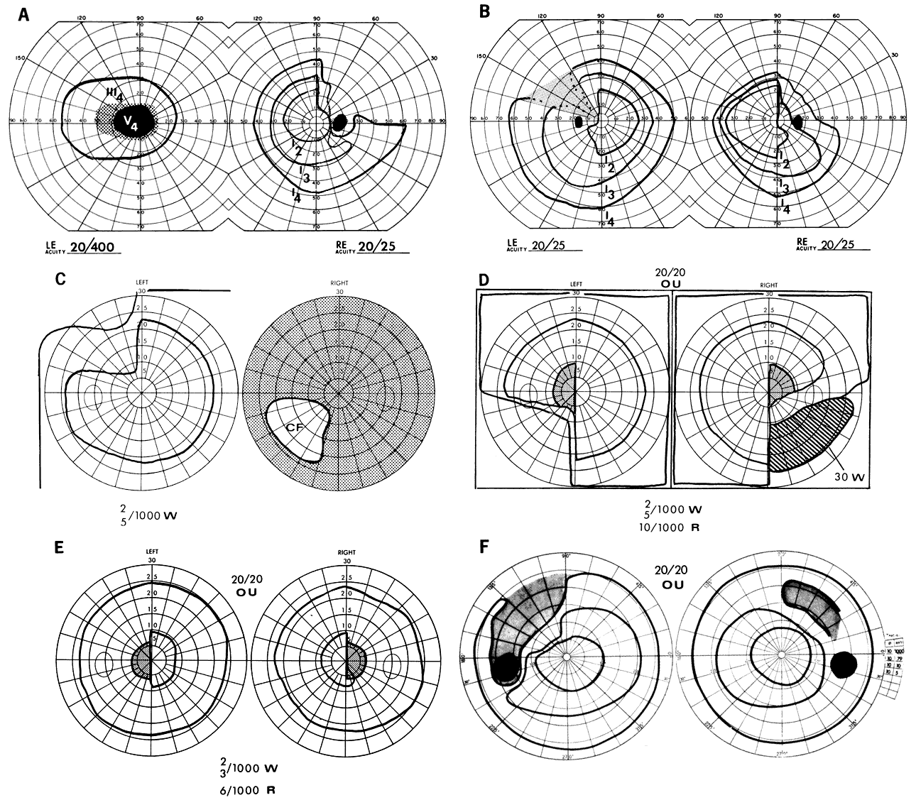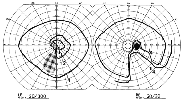 on a bitemporal theme (Fig. 1). Asymmetry of field loss is the rule, such that one eye may show advanced