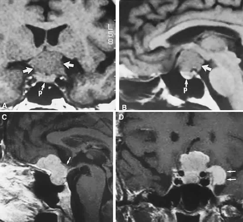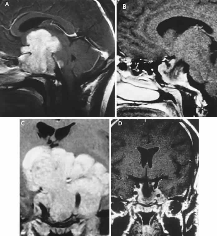 The clinical and radiographic characteristics of primary empty sella were thoroughly reviewed by Neelon and associates,220 the following features being notable: obese women predominate (27 women, 4 men), ranging in age from 27 to 72 years, with a mean age of 49 years; headache is a common symptom; in the Duke University study there was no instance of visual impairment due to chiasmal interference; an enlarged sella was found serendipitously on plain skull films obtained for evaluation of headaches, syncope, or other symptoms; pseudotumor cerebri was present in 4 women; 20 patients had normal pituitary function, and 8 demonstrated endocrine disturbances that included panhypopituitarism, or GH, gonadotropin, and thyrotropin deficiency. Hyperprolactinemia may occur in patients with intrasellar cisternal herniation without evidence of pituitary tumor, but the elevation of serum PRL is usually moderate. For example, in a study221 of 47 patients with empty sella, hyperprolactinemia was found in 6, with a range of 39 to 123 ng/L. Of course, adequate neuroimaging with enhanced CT or MRI (Fig. 20) will resolve the question of empty sella vs. mass lesion. Children are rarely included in this diagnostic category, but they are reported222 with primary empty sella and associated congenital anomalies, including delayed puberty, anosmia, diabetes insipidus, delayed growth, and optic atrophy.223 In a series of 19 patients with primary empty sella at the University of Michigan,224 the following features were noteworthy: all were women; 12 patients complained initially of headache; in 7 patients, visual disturbances were prominent subjective symptoms (blurred vision, diplopia, micropsia); 3 had bilateral papilledema and were believed to have pseudotumor cerebri; and 2 patients demonstrated minimal relative hemianopias without obvious cause. Although it is speculated that the high female preponderance noted in all series implies a mechanism related to physiologic hypertrophy and subsequent involution of the pituitary gland during pregnancy, there was no significant relationship between the number of pregnancies and sellar volume in the Duke University series. In the secondary form of empty sella that occurs following pituitary surgery or irradiation, adhesions may form between tumor “capsule” (or sellar diaphragm) and the optic nerves and chiasm. Retraction of these adhesions may draw the visual system downward into the empty sella, with resulting visual defects.225,226 Packing the sellar cavity prophylactically to elevate the diaphragma has been proposed,224 or “chiasmapexy” when chiasmal herniation is observed at surgical re-exploration.227 |