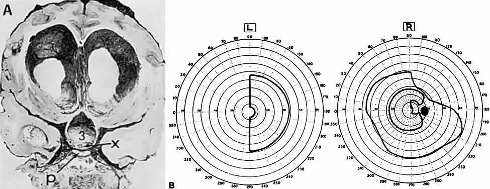 therapy. Peculiar sensory phenomena are experienced by some patients with usually well-developed field defects, consisting of a nonparetic form of diplopia and clumsiness in visual tasks requiring depth perception (e.g., seating the tip of a screwdriver, threading a needle). Loss of portions of normally superimposed binocular field results in absence of corresponding points in visual space (or on the retinas) and subsequently in diminished fusional capacity. In essence, the patient is subjected to two “free-floating” nasal hemifields without interhemispheral linkage to keep them aligned. Vertical and horizontal slippage produces doubling of images, gaps in otherwise continuous visual panorama, and steps in horizontal lines. Elkington1 noted that the preoperative symptoms in a series of 260 patients with pituitary adenoma included some degree of double vision in 98 patients, but a demonstrable ocular palsy was present in only 14. In addition, without temporal fields, objects beyond the point of binocular fixation fall on nonseeing nasal retina, so that a blind area exists, with extinction of objects beyond the fixation point. These bitemporal hemianopic sensory phenomena are discussed at length by Nachtigaller and Hoyt.2 The association of extraocular muscle palsies with chiasmal field defects implies involvement of the structures in the cavernous sinus, usually a sign of rapid expansion of a pituitary adenoma (see Volume 2, Chapter 12). Except in children, only rarely is tumor diagnosis delayed sufficiently for obstruction of the ventricular system to occur, with elevation of intracranial pressure and lateral rectus weakness. Pallor of the optic discs, although an anticipated physical sign of chiasmal interference, is not a requisite in diagnosis. In a series of 156 cases of pituitary tumors, Chamlin and associates3 found optic atrophy in only 155 of 312 eyes (50%). Wilson and Falconer4 also found unequivocal disc pallor in only 28 of 50 patients; they pointed out that optic atrophy may not be present even when visual symptoms have lasted as long as 2 years. Even extensive field loss in chiasmal syndromes may be associated with normal or minimally pale discs. Therefore, it is unwise to rely on the presence of optic atrophy as an indication of chiasmal interference; disc pallor is corroborative evidence at best, greater weight being placed on carefully evaluated visual fields. It is risky to predict on the basis of disc appearance the ultimate level of vision anticipated following chiasmal decompression. As a rule, the more atrophic the disc, and the greater the duration of visual symptoms, the less likely is the return of function in defective areas of field, but recuperation of vision to surprisingly good levels, in spite of relatively advanced disc pallor, does indeed occur. Suprasellar tumors of presumed prenatal origin, such as optic gliomas or craniopharyngiomas, may be associated with congenitally dysplastic optic discs. These disc anomalies include variable hypoplasia, tilted or “irregularly oval” nerve heads,5 or enlarged discs.6 Techniques for the screening or elaboration of field defects are discussed in Volume 2, Chapter 2. The importance of establishing that the vertical meridian forms the central border of the temporal defect is paramount in distinguishing true chiasmal interference from temporal field depression that simulates temporal hemianopias. Those conditions that can mimic chiasmal field defects include the following (see Volume 2, Chapter 5, Part II):