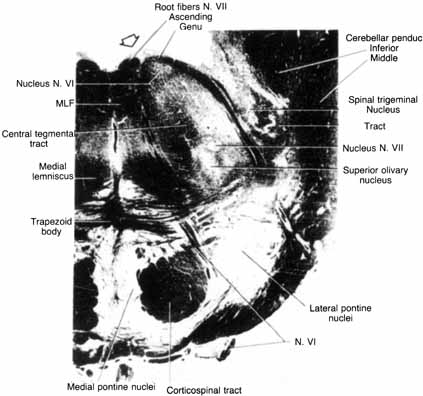 The most common finding associated with developmental facial paralysis is the presence of one or more other congenital anomalies. Weakness of the lower lip has particular significance in that it may be associated with multiple congenital anomalies. In one study of asymmetric facies, noted especially during crying, associated congenital anomalies were found in the skeletal, genitourinary, respiratory, and cardiovascular systems119 Developmental bilateral facial palsy is often incomplete, with the lower portion of the face usually less affected than the upper part. This distinguishes it from facial palsy due to trauma, which is rarely bilateral and shows equal involvement of the lower and upper face. Bilateral immobility of the face may not be apparent at birth and may be manifested by incomplete eyelid closure when asleep, by a gaping mouth, and by an inability to suck. Möbius' syndrome is a rare congenital disorder that usually includes bilateral hypoplasia of facial muscles, unilateral or bilateral horizontal gaze palsy, anomalies of the extremities, absence of chest muscles, and involvement of other cranial nerves, especially the hypoglossal. Neuroimaging may demonstrate brainstem hypoplasia and calcification. Many pathologic findings have been described in Möbius' syndrome, including nuclear aplasia and neuronal degeneration (Fig. 21) (see elsewhere in these volumes).120 There is no effective way to restore facial function in the newborn or young child with a facial paralysis due to a congenital anomaly. Management should be directed toward preventing complications and performing reanimation procedures as the patient approaches the teens. Children with facial paralysis from birth usu-ally do not have problems with keratitis and corneal scarring unless there is a poor Bell's phenomenon, decreased tearing, or entropion with irritation of the globe from eyelashes rubbing against the cornea. The child should undergo slit lamp evaluation periodically, and if there is any evidence of frank keratitis, medical and perhaps surgical measures should be considered to correct the deformities. |