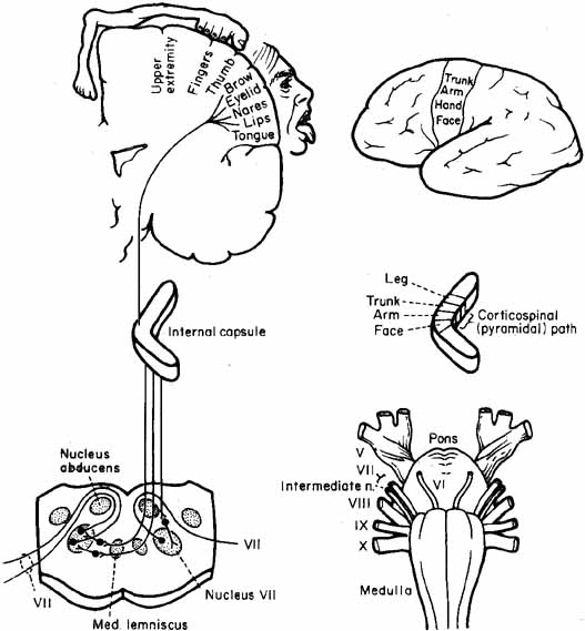 CORTEX AND SUPRANUCLEAR PATHWAY The voluntary responses of facial muscles, such as smiling or grimacing on command, are dependent on discharges from the facial motor area situated in the precentral gyrus of the frontal cerebral cortex. The facial motor areas are represented with the forehead uppermost and the eyelids, midface, nose, and lips located sequentially below (Fig. 3). Supranuclear motor neurons from the cortical face area are carried as fascicles of the corticobulbar tract to the genu of the internal capsule, then via the cerebral peduncles to the lower pons or upper medulla. The portion of the facial nucleus that supplies the muscles of the upper face (frontalis, orbicularis oculi, and corrugator muscles) receives corticobulbar fibers from both right and left precentral motor cortices, but the supranuclear tracts innervating the lower face are crossed only. For this reason, the muscles that raise and wrinkle the forehead and close both eyes are bilaterally innervated. Thus, a unilateral lesion in the cortex or supranuclear pathways spares eyelid closure and forehead movement but results in paralysis of the contralateral lower face. This dissociation is characteristic of supranuclear lesions. Because the supranuclear pathways may descend to the ventromedial medulla before decussating to innervate the facial nucleus, low brainstem lesions may produce contralateral lower facial weakness.6 However, it is also possible to show upper facial sparing with lesions of the pontine facial nucleus, with selective defects within the temporal bone, or even with an injury to nerve rootlets within the parotid gland or facial musculature. This phenomenon is related to the general tendency for facial nerve function to be spatially dispersed, not only in its cortical distribution but also within the pontine nucleus and in the peripheral nerve.