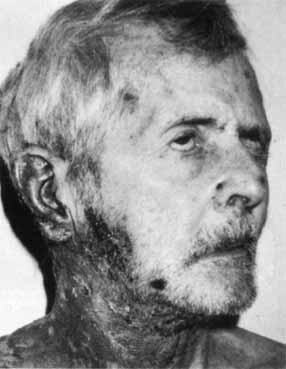 PROGRESSIVE HEMIFACIAL ATROPHY (PARRY-ROMBERG SYNDROME) Hemifacial atrophy is an unusual condition of unknown etiology. It is characterized by spontaneous and slowly progressive atrophy of the skin and subcutaneous tissue on one side of the face and scalp (Fig. 19). There is a slight female predominance, and the disorder typically begins within the first two decades of life. Involvement of the soft tissues surrounding the orbit and in the orbit is common, such that progressive unilateral enophthalmos occurs107 Other findings include focal alopecia, loss of lashes and eyebrow hairs, linear scarring of the scalp (en coupe de sabre), exophthalmos, poliosis, ptosis, miosis, mydriasis, iris heterochromia, uveitis, motility disturbances, corneal opacities, refractive error, and optic nerve atrophy. The presence of subtle fundus abnormalities, including choroidal atrophy, retinal telangiectasis, and retinal pigment epithelium changes, has been documented.108 Besides migraine headache, the most common neurologic complication is seizures, which may be generalized or focal in nature.109 Other reported neurologic associations include hemiparesis, hemianesthesia, hemianopia, and aphasia. Chung and colleagues110 reported a case of epilepsy with frontal lobe leptomeningeal sclerosis subjacent to forehead scleroderma. There is no treatment for this disorder, and reconstructive surgery is best delayed until progression ceases. |