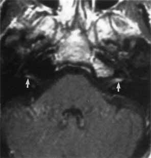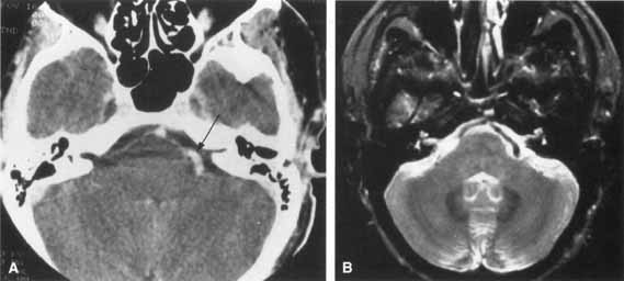 FACIAL NEUROMA The facial paralysis associated with facial nerve neuromas usually has a gradual onset, but it may be more rapid, simulating idiopathic facial paralysis. Indeed, the pareses may fluctuate or may be associated with hemifacial spasm. In some cases, hearing loss precedes the onset of facial weakness, thereby simulating an acoustic neuroma.93 CT scan typically shows a uniformly enhancing mass in the fallopian canal. T2-weighted MRI images may show a hyperintense mass in the facial canal89 that enhances with gadolinium on T1-weighted images (Fig. 16). The ultimate diagnosis of facial neuroma requires surgical exploration and biopsy. Biopsy usually results in facial paralysis. This possibility should be discussed with the patient before surgery. Facial function recovery after resection of tumor and grafting, although never normal, may include restored tone, symmetry, and weak voluntary movement. The more facial function present before surgery, the better the results with grafting. This observation must be shared with the patient, because he or she might elect to wait until facial function is lost before consenting to surgical removal. When the tumor is located eccentrically, removal is possible with preservation of facial function.94 METASTATIC LESIONS A history of cancer (particularly involving the breast, lung, thyroid, kidney, ovary, or prostate) associated with a rapidly progressive facial paralysis strongly suggests a metastatic lesion. The facial nerve may be involved by a bony metastasis or by meningeal infiltration. Neuroimaging studies are indicated to search for the primary site and to localize the site of facial nerve involvement (Fig. 17). If these are unrevealing, serial lumbar punctures may be necessary to exclude meningeal carcinomatosis. In some cases, surgical exploration of the temporal bone or of the extracranial course of the facial nerve is recommended to locate the lesion. In one study of meningeal carcinomatosis, the seventh nerve was affected in 15 of 90 patients.95 Facial nerve involvement is often unilateral, but it occurs bilaterally in about 10% of such patients.96