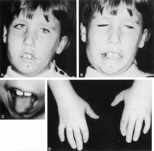 myotonic dystrophy. Recurrent facial paralysis has been noted to occur in an idiopathic form, the Melkersson-Rosenthal syndrome, and even with tumors.111 The recurrence rate in our experience with idiopathic palsy was 12%. In contrast to recurrent facial paralysis on the same side, contralateral recurrence is almost always due to idiopathic palsy; alternating facial paralysis has been noted only rarely with other disorders. Melkersson-Rosenthal syndrome (Fig. 20) is the most common example of a rare disorder that features recurrent alternating facial palsy; recurrent edema of the lips, face, and eyelids; cheilitis; and fissured tongue. Most authors agree that the presence of any two of these four manifestations permits the diagnosis.112 It has been suggested that facial swelling is the most consistent finding in Melkersson-Rosenthal syndrome.113 Perhaps the diagnosis of this syndrome should be reserved for only those patients with the finding of facial edema, because there is recurrence in 12% of Bell's palsy patients, and a fissured tongue can be seen in otherwise normal persons. The etiology of Melkersson-Rosenthal syndrome is unknown, although biopsy findings of buccal mucosa have shown noncaseating granulomas. Associated ophthalmic findings have included retrobulbar neuritis, lagophthalmos, corneal opacities, and keratoconjunctivitis sicca. Treatment has largely been unsuccessful and has included trials of antibiotics, antihistamines, irradiation, steroids,113 and more recently, thalidomide.