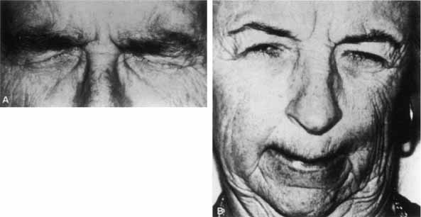 recovery of facial palsies, tonic contracture, and myokymias. BLEPHAROSPASM This condition is characterized by involuntary, bilateral spasmodic eye closure. Forceful contraction of the orbicularis oculi muscle is present, accompanied by tonic depression of the eyebrows (Fig. 22). Unlike hemifacial spasm, which is unilateral, blepharospasm tends not to involve the lower face or platysma. Secondary blepharospasm is the result of ocular irritation and may be seen in cases of keratitis, scleritis, or uveitis or after the application of topical ocular medications. Once ocular irritation has been excluded, primary blepharospasm should be considered in a variety of extrapyramidal disorders, including Parkinson's disease, postencephalitic parkinsonism, Huntington's chorea, bilateral basal ganglia infarction,121 and Meige's syndrome (blepharospasm and oral facial dystonia). In some patients, blepharospasm may have a multifactorial etiology including a combination of altered brain inhibition and local ocular disease.122 Functional MRI studies suggest that benign essential blepharospasm is produced by an inappropriate activation of the striatum, particularly a subregion of the putamen.123 Putamen dysfunction could lead to an exaggerated compensatory response to dry eyes or excessive blinking even in the absence of an ocular disease.124 Blepharospasm should also be considered as a side effect of dopamine agonists and antagonists.125 For the most part, medical therapy of blepharospasm is disappointing. Pharmacologic therapy with dopamine-depleting agents, neuroleptics, sedatives, centrally acting cholinergic drugs, and gamma-aminobutyric acid agonists has had variable success. Psychotherapy and biofeedback also have been helpful in a limited number of cases.125 Surgical therapy is a last resort and has included procedures directed at weakening the facial nerve126 or stripping the orbicularis oculi muscle.127 These procedures are often limited by complications such as facial weakness, ectropion, and recurrent blepharospasm. Many studies strongly support the use of botulinum, a presynaptic blocking agent injected subcutaneously into the orbicularis oculi muscles.128–130 Most patients enjoy a significant reduction in the facial spasm within a few days of the injection, and these effects last several months. Complications are usually mild and transient, including ptosis, exposure keratopathy, lower facial weakness, and ecchymosis around the injection sites. Recurrence of facial spasm occurs in almost all patients within several months, but repeated injections are well tolerated. HEMIFACIAL SPASM Hemifacial spasm is the result of unilateral, hyperactive facial nerve dysfunction and is characterized by the spontaneous onset of unilateral intermittent spasms of the orbicularis oculi muscle. These spasms gradually increase in severity and frequency and spread downward to involve the muscles of facial expression, including the platysma (Fig. 23). Hemifacial spasm should be distinguished from facial tics that begin in childhood and can be suppressed voluntarily for a period of time. Focal epilepsy involving the face can also be distinguished from hemifacial spasm by the presence of an abnormal electroencephalogram or the appearance of a postictal facial paralysis (Todd's paralysis). The spasms are usually brief, lasting only seconds, and may persist during sleep. Rarely is a specific cause of hemifacial spasm uncovered, but vascular compression of the facial nerve at its exit from the brain stem has been frequently implicated and may be demonstrated by high-resolution magnetic resonance tomographic angiography (MRTA).131