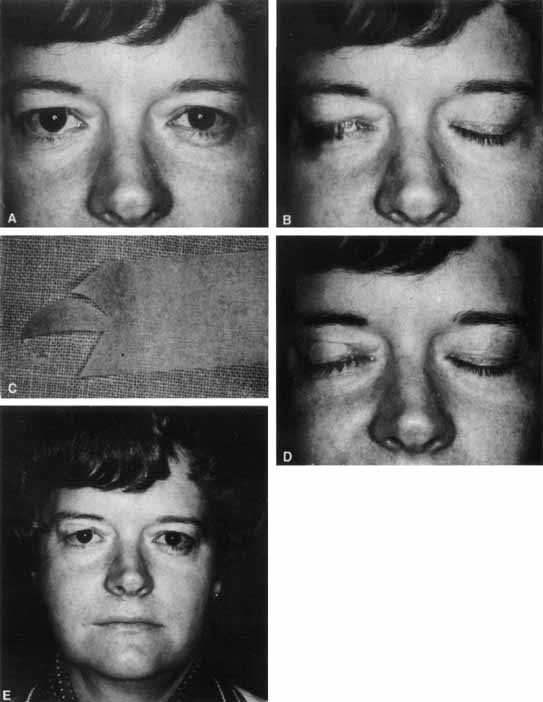 fold in the upper lid (Fig. 28). When the eyelids are difficult to tape shut, temporary tarsorrhaphy using lid sutures or botulinum A toxin-induced ptosis may be preferable.171 The latter technique involves injection of botulinum toxin into the levator palpebral muscle on the side of the facial paresis. This induced ptosis protects the cornea from further exposure and promotes healing of damaged epithelium for several weeks. These two techniques are reserved for those patients who are not responding to the methods already mentioned; they are the last resorts before considering more complicated surgical techniques. Surgery to reanimate the paralyzed eyelids should be considered if medical treatment is ineffective, especially for patients who lack Bell's phenomenon, have corneal anesthesia, and have dry eye—the BAD syndrome. A number of surgical procedures are available to achieve eyelid closure, including the use of a palpebral spring172–174 or a gold weight175,176 to correct upper lid lagophthalmos. The lower lid can also be elevated surgically to prevent corneal exposure. These techniques are preferable to permanent tarsorrhaphy, which may lead to a deformed lid configuration and a constricted visual field from a narrowed palpebral aperture. Finally, hypoglossal-facial anastomosis177 and temporalis muscle transposition are useful procedures when lower facial movement is desired and direct anastomosis of the facial nerve cannot be performed within 30 days. |