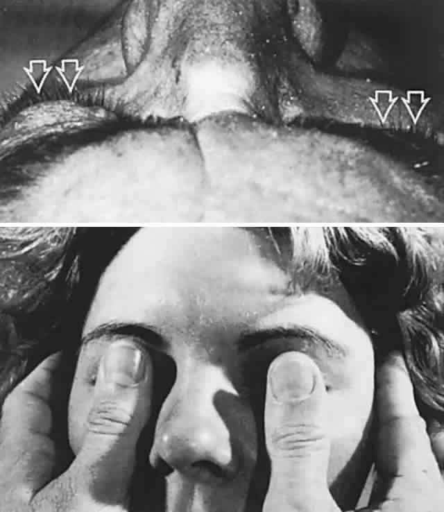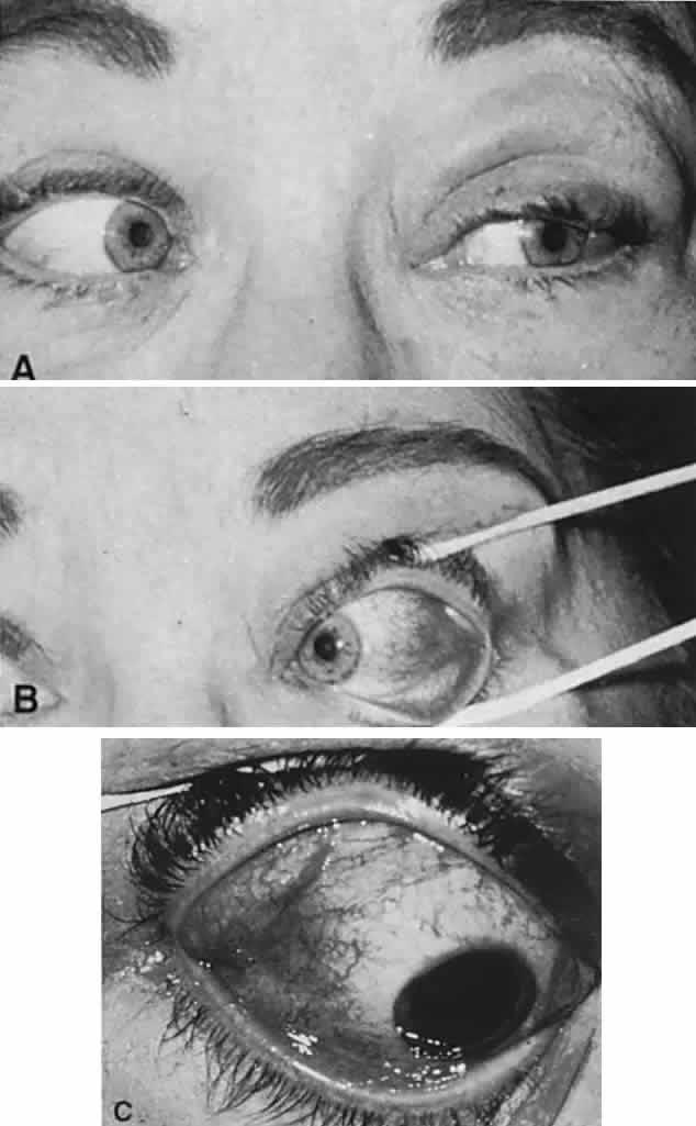 Since Graves' disease represents the most common orbital ailment, the lids must be carefully evaluated for spontaneous retraction (Fig. 4; see also Volume 2, Chapter 3, Fig. 11) or for induced lag on slow ocular pursuit movements from upward to downward. Preliminary observations of the lids should be made during history-taking, before the patient's attention is called to the actual examination; some patients will stare during intense concentration or conscious effort to cooperate. True stare should be spontaneous, and lag reproducible. Lid position and movement defects must be assessed before sympathomimetic agents are instilled for pupil dilation; for example, phenylephrine (Neosynephrine) will induce moderate to marked lid retraction that masks pathologic lid position.
