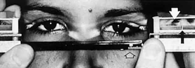 Lid swelling regularly results from the congestive edema of Graves' disease, but also typically occurs in preseptal or orbital cellulitis, inflammatory pseudotumor, arteriovenous fistulas, and with acute viral conjunctivitis. For obscure reasons, chronic orbital neoplasms may cause intermittent lid edema. Most lid edema is accentuated by sleep, during which time the head is maintained in a relatively dependent position. Palpation of a discrete mass in the lids is exceedingly helpful, since potential biopsy is facilitated. Veins may be visible within the thin lid tissues, either passively dilated by diffusely increased orbital pressure, or engorged by arterialization of orbital and adnexal vessels fed by arteriovenous communications. In the latter case, audible bruits and palpable thrills are evidence of turbulent, increased blood flow. Abnormalities of the conjunctiva may serve as clues to orbital diagnosis. In general, edema (chemosis) is too nonspecific a finding to be very helpful, being common in Graves' disease, inflammatory pseudotumor, and arteriovenous fistulas. Any retrobulbar mass may produce chronic or intermittent chemosis, presumably by interfering with venous drainage in the orbit. In Graves' ophthalmopathy, the vessels overlying the insertions of especially the medial and lateral recti muscles are commonly enlarged, and indeed the muscle insertions themselves may be visibly hypertrophied (Fig. 5). These two conjunctival signs are exceedingly useful in identifying Graves' orbitopathy and should be sought in cases of unexplained proptosis and/or diplopia. Also, engorgement of orbital vessels may be reflected as hypervascularity of conjunctival and scleral vessels, which take on a more-or-less specific pattern in the presence of arteriovenous fistula (see Volume 2, Chapter 17, Fig. 14). Diffuse or focal hyperemia of scleral and episcleral vessels (especially in the superior lateral quadrant of the globe) is seen in anterior scleritis (episcleritis), or as an anterior component of posterior scleritis that accompanies the painful ophthalmoplegia syndrome of idiopathic orbital inflammation (Fig. 6). The position of the globes relative to the orbital rims is subject to considerable individual and racial variations. Not the least problem is accuracy and reproducibility of measurements as obtained by a number of exophthalmometric techniques, of which the Hertel exophthalmometer is the most common, and probably the most accurate (Fig. 7). In a study of 681 normal adults ranging in age from 18 to 91 years, mean normal protrusion values were 15.4 mm in white women, 16.5 mm in white men, 17.8 mm in black women, and 18.5 mm in black men; upper limits of normal were 20.1, 21.7, 23.0, and 24.7 mm, respectively.15 No normal individual showed more than 2 mm of asymmetry. To reiterate, there is no clinically precise technique for quantitating proptosis, as minor deviations in positioning of exophthalmometers at the lateral orbital rim result in gross variations in readings. Depending on technique and experience, substantial interobserver variation is demonstrable.16 Subtle degrees of proptosis are difficult to detect and more difficult still to measure. The following techniques are useful in determining the presence of relative unilateral proptosis: viewing the position of the globes and lids from above the brows (Fig. 8, top); insertion of fingertips between inferior orbital rim and globe; and simultaneous palpation of corneal apices (Fig. 8, bottom). The clinician should be aware of several situations in which proptosis is more apparent than real, that is, a condition of pseudo-exophthalmos: unilateral lid retraction, wherein the homolateral eye appears larger; unilateral mild ptosis, wherein the contralateral eye appears larger; asymmetry of facial bones including orbital rims; and unilateral enophthalmos,17 wherein the normal contralateral eye appears prominent (Fig. 9). The differential diagnosis of enophthalmos is included in Table 3.