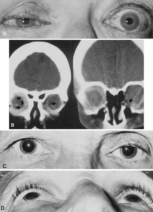 CLINICAL FEATURES The highly variable clinical course of thyroid ophthalmopathy ranges from no signs and symptoms to complete loss of vision and disfiguring exophthalmos. As discussed previously, ophthalmic evaluation includes standard assessment of visual function, with special attention to measurement of proptosis, eyelid morphology (edema), movement and position, corneal evaluation, and determination of motility. In situations of visual changes, optic nerve functions are included (see Chapter 5). Signs and symptoms of Graves' ophthalmopathy arise from a discrepancy between the expanded volume of the retrobulbar tissues and the fixed volume of the bony orbit. Treatment strategy is directed at either shrinking the volume of the hypertrophied orbital tissues or expanding the volume of the orbit. The overall approach is one of conservatism in the early stages until the systemic disease is evaluated, treated, and stabilized over a period of 6 to 12 months. More immediate and aggressive therapy may be instituted in cases of compressive optic neuropathy or serious corneal exposure complications. Management of the orbitopathy is mainly palliative to minimize ocular discomfort and prevent loss of vision and disfigurement. Nonsurgical measures used to reduce the expanded soft tissue volume include corticosteroids, cyclosporine, combinations of corticosteroids and cyclosporine,77 or orbital radiation therapy. Extraconal and intraconal fat extirpation without bone removal is a surgical attempt to ease this volume disparity. Mild to moderate corneal involvement can be treated with lubricants, moist chamber, and/or taping the eyelids at night. Severe corneal involvement may necessitate tarsorrhaphy or decompression surgery. During sleep, head elevation on more than one pillow or with other devices may reduce periorbital edema in the morning. Prisms in spectacles are effective in controlling double vision in primary gaze when the motility restriction is mild to moderate. Botox (botulinum toxin) injections have also been used to control strabismus in patients with restrictive strabismus. Corticosteroids are reserved for patients showing aggressive inflammatory signs (e.g., rapidly progressive proptosis, corneal exposure, and/or compressive optic neuropathy).31 Strabismus, lid retraction, and modest proptosis usually do not improve much with steroid therapy. The potential risks and side effects of corticosteroids must be considered. Radiation therapy is used to halt the progressive inflammatory component of the condition, rapidly progressive congestive orbitopathy, optic neuropathy, or where complications of corticosteroid therapy are intolerable, but is usually unproductive in chronic stable orbitopathy.31–33 External beam radiation dosage of 1500 to 2000 cGy is given, 180 to 200 cGy per sessions. Corticosteroid therapy may be continued during irradiation, then gradually tapered. A response is usually seen over a 6-week period, with maximum improvement observed over the course of 4 months. In the case of compressive optic neuropathy, if the optic neuropathy is severe or rapidly progressive, orbital decompression should be considered. Soft tissue inflammatory signs and proptosis are usually reduced; however, strabismus is infrequently improved with radiotherapy. Orbital radiation has been effective in about two-thirds of patients, although approximately 30% of these patients will require some surgical procedure at a later date. Orbital radiation is expensive to perform, and its potential complications include eyelid and facial erythema and dry eye; cataract, radiation retinopathy or optic neuropathy, and secondary malignancy are associated with doses greater than 5000 cGy, but are remote possibilities with low dosage used for Graves' or other inflammatory orbitopathies. Surgical rehabilitation needs to be individualized and performed in stages. Corrective surgical measures should not be undertaken until the inflammatory process has abated and the condition has remained stable for at least 6 months. If more than one type of surgery is indicated, the order in which it should be undertaken is as follows: orbital decompression, strabismus surgery, eyelid retraction repair, and blepharoplasty.78 This logical sequence is important because the first procedure could influence the indications and findings to be addressed by the following procedure. For example, orbital decompression may actually cause and worsen a pre-existing strabismus condition, and the subsequent muscle surgery would need to correct these abnormalities. If orbital decompression is not required prior to strabismus or eyelid surgery, strabismus surgery should be delayed until the orbits are no longer inflamed. ORBITAL DECOMPRESSION Orbital decompression is indicated for the following conditions: apical compressive optic neuropathy that fails to reverse with high-dose corticosteroids and/or radiation therapy, severe corneal exposure refractory to medical treatment, disfiguring proptosis, recurrent spontaneous globe subluxation, and severe orbital inflammation inadequately treated by corticosteroids or radiation therapy. Decompression has been described for all four walls of the orbit.79–82 Orbital decompression for the treatment of compressive optic neuropathy must emphasize decompression of the orbital apex and optic nerve. The medial and superior walls are the only walls that extend posteriorly to the optic nerve canal; thus at least one of these walls should be decompressed in the treatment of compressive optic neuropathy. Laterally, decompression of the apex is limited by the temporal lobe of the brain. Inferior orbitotomy does not reach the orbital apex, as decompression is limited to the posterior wall of the maxillary sinus. The most common method of orbital expansion to relieve apical compression is a two-wall decompression into the ethmoidal sinus and the maxillary antrum. This is typically performed through a subciliary or trans