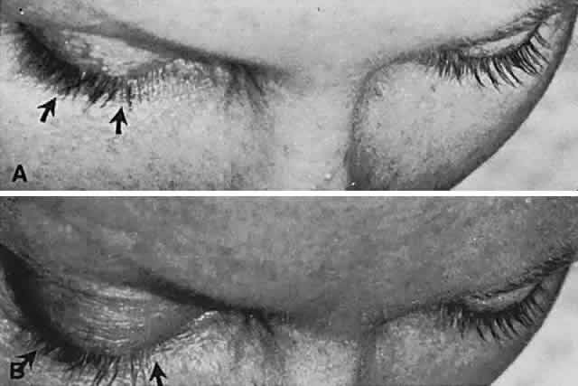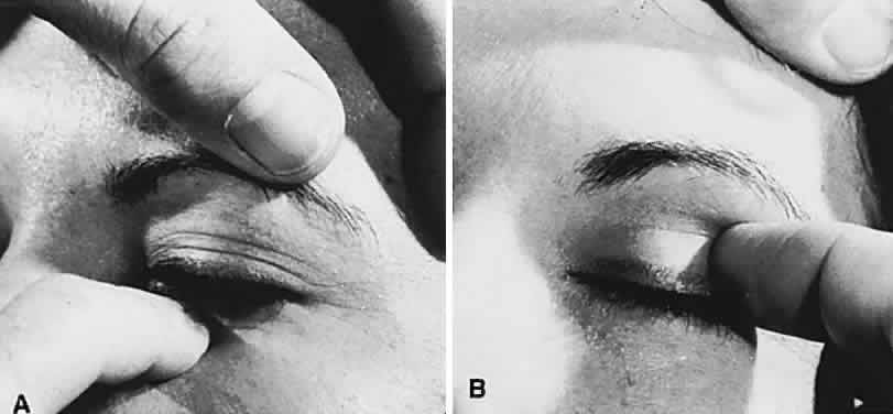 Anomalies of lid position and movement need not be bilateral. Ptosis is quite rare in Graves' disease, but is fairly common with inflammatory pseudotumor. Ptosis, in the absence of pain or other congestive orbital signs, should always bring to mind the possibility of myasthenia. Unilateral ptosis may account for contralateral lid retraction; thus, a patient with right partial ptosis may show relative retraction of the left upper lid, due to increased effort in an attempt to overcome the ptosis (Hering's law of equivalent innervation is applicable to the two levator palpebrae).14 If the eye with ptosis is occluded, or the lid mechanically raised, the opposite retracted lid will assume a normal position. The causes of lid retraction are the following:
