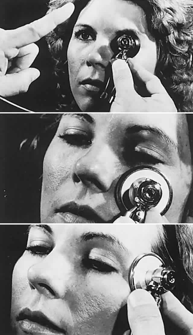 Biomicroscopical examination usually reveals even minimal pulsation, best seen during measurement of intraocular tension by Goldmann applanation tonometry. Cotton-swab sticks may be placed tangentially across the corneal apices, such that transmitted pulsations are amplified by the length of the swab (Fig. 10).