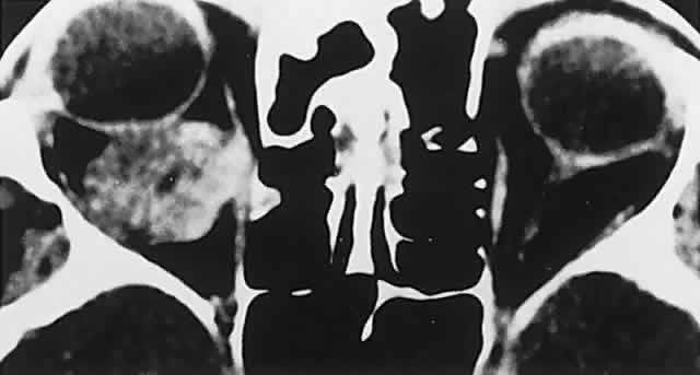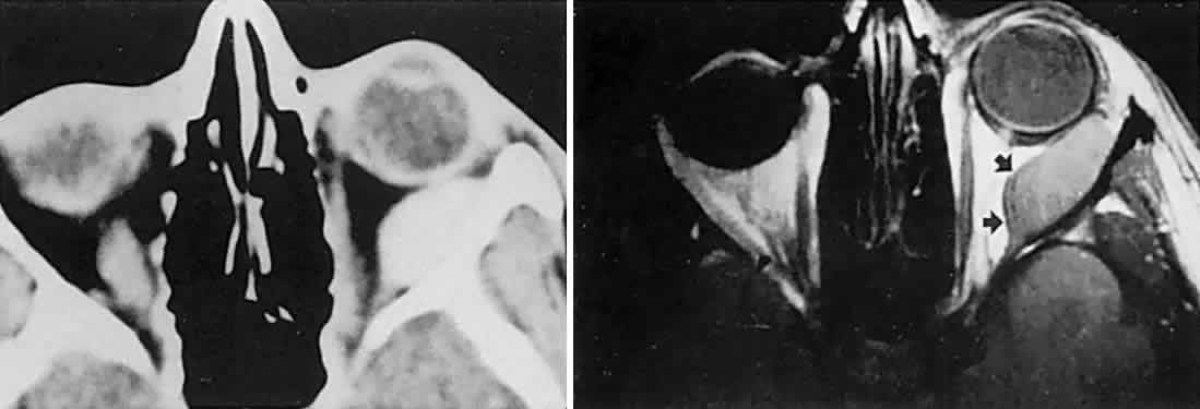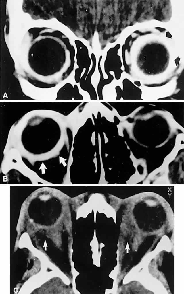 GRAVES' DISEASE Graves' congestive orbitopathy is the single most common orbital disorder, with annual incidence rates ranging from 12 to 20 per 100,000 population, and with higher prevalence rates (42%) among Caucasian (European) groups than in Asians (8%). The age-specific incidence rates are greatest among middle-aged patients, and are approximately four times higher in women than in men. In patients with hyperthyroidism, ophthalmopathy is evident in 25% to 50%, but severe complications evolve in just 3% to 5%. Several studies have linked tobacco smoking to increased severity of Graves' orbitopathy,28 possibly related to alterations in immunoregulatory cell function induced by smoking, and increased synthesis of glycosaminoglycans by orbital fibroblasts. Thyroid eye disease is usually associated with hyperthyroidism, and less frequently with Hashimoto's thyroiditis, euthyroid states, thyroid carcinoma, or primary hyperthyroidism. About 80% of patients will develop signs of ophthalmopathy either during the year before or the year after a diagnosis of thyroid malfunction.29 Tallstedt et al30 demonstrated a two- to threefold increase in risk of developing orbitopathy when the thyroid disease was managed with radioactive iodine treatment as opposed to surgical or medical treatment; this effect may be related to the release of thyroid antigens and to subsequent enhancement of autoimmune response directed toward antigens shared by the thyroid and the orbit. Evolution of ophthalmopathy after radioiodine therapy is often transient and may be ameliorated by the administration of prednisone.28,31 The principal signs are lid retraction and edema, proptosis, and diplopia. If congestive signs are slight, the ocular motor defects are regularly misdiagnosed, and unsuitable studies for intracranial disease follow. Eye movement defects with Graves' disease are discussed in detail in Volume 2, Chapter 12. Infrequently Graves' disease presents in an acute inflammatory form that mimics orbital cellulitis or idiopathic pseudotumor, including pain, lid swelling with ptosis, diplopia and infrequently visual loss.32 Proptosis and restrictive myopathy also may occur in children with hyperthyroidism.33 Obscured by the more obvious external congestive signs and by symptoms of diplopia, the complication of compressive optic neuropathy may be overlooked. Although its incidence is said to be less than 5% among patients with typical thyroid disease, Graves' optic neuropathy is a treatable cause of potentially disabling visual loss (see also Volume 2, Chapter 5, Part II). Congestive symptoms always precede visual loss, which is usually gradual in onset and bilateral in most patients, but may occasionally be acute and asymmetrical. Presenting acuities are poorer than 20/60 in 50% of cases; central scotomas, at times combined with inferior field depression, are the predominant field defects. Congestive signs are usually of moderate intensity without severe proptosis or exposure keratopathy. Bilateral and symmetrical ductional restriction is the most commonly associated motility disturbance. Oral corticosteroids are often effective in restoring visual function, but steroid-unresponsive neuropathy may be improved promptly by supervoltage orbital irradiation or surgical decompression.34,35 The medical management of Graves' disease is complex and demands a comprehensive approach, often requiring a variety of surgical (see below) and radiotherapeutic interventions.36,37 It is worth noting that Graves' ophthalmopathy frequently presents or worsens weeks to months after radioactive iodine ablative therapy, and that concomitant corticosteroid therapy may ameliorate this effect.28,31,38 Char39 has reviewed the immune mechanisms by which intrathyroidal clonally restricted B-cells secrete autoantibodies, with extraocular muscle and orbital tissues, including fibroblasts, acting as antigenic targets; fibroblasts in turn produce glycosaminoglycan that binds water, increasing orbital connective tissue volume. Prednisone, cyclosporine, and irradiation, in variable combinations, are all applicable forms of therapy. Indeed, in the Mayo Clinic experience40 of therapies for Graves' ophthalmopathy, only 20% of patients required one or more surgical procedures; 7 of 120 patients (6%) developed optic neuropathy. INFLAMMATIONS Orbital inflammatory disease may take several distinct forms. Acute orbital cellulitis is defined as infectious inflammation of soft tissues posterior to the orbital septum, characterized by distension and hyperemia of the lids and conjunctiva, pain, proptosis, and limitation of eye movements. Although sinus infections were formerly frequently associated, this is now a relatively rare condition, thanks to the availability of antibiotics. However, the condition is potentially life-threatening. Principal predisposing risk factors include ocular or adnexal surgical procedures (lid, strabismus, or retinal operations), facial or orbital trauma, especially with retained orbital foreign bodies, dacryocystitis or other periorbital infections, insect bite envenomization, diabetes, and immunosuppressive states. Especially in children and young adults, orbital cellulitis is still associated with ethmoidal and maxillary sinusitis. Those bacterial agents commonly responsible for sinusitis (predominantly Streptococcus pneumoniae, Staphylococcus aureus, and less frequently Haemophilus influenzae), not surprisingly are implicated in orbital cellulitis.41 Rapidly progressive rhabdomyosarcoma may present a clinical picture of pseudocellulitis in children (see Fig. 3). CT scanning or MRI is mandatory, not only to disclose sinus disease, but also to determine the presence of meningitis, cavernous sinus thrombosis, or orbital abscess formation, which requires surgical drainage. Most associated abscesses occur in the medial orbit adjacent to the ethmoidal sinuses, with spread of infection via communicating veins (septic thrombophlebitis) o