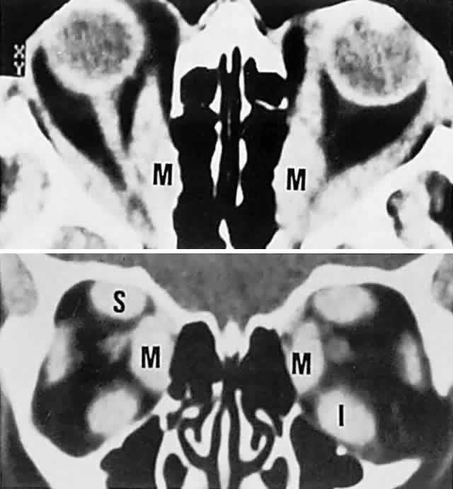 Thin-section (1.5–3.0 mm) contiguous overlaps with bone-window settings provide a sensitive detector of orbital bone fractures, especially with regard to floor defects (blowout fracture),60,68 and CT analysis of orbital volume and degree of soft tissue herniation may have prognostic value for risk of delayed enophthalmos.69 Thin-section CT, thus, has replaced complex motion laminography in defining fractures, erosions, expansions, and hyperostosis of the bony walls of the orbit or skull base. Graves' disease is the overwhelming single most common cause of single or multiple extraocular muscle thickening (Fig. 18; see also Volume 2, Chapter 12, Figs. 28 and 30); inflammatory myositis is considerably less frequent, and muscle metastases are quite rare. Passive congestive myopathy also accompanies arteriovenous shunts and lesions of the superior orbital fissure and cavernous sinus, where orbital venous return is obstructed. The capacity of CT to detect minor to moderate changes in muscle diameter is perhaps limited,70 and standardized A-scan ultrasonography seems more sensitive and practical.71 Now almost universally available, MRI is the preferable technique for imaging the soft tissue contents of the orbit, high-resolution 3-mm and thinner sections being available, as well as gadolinium contrast enhancement (Figs. 19, 20, and 21).