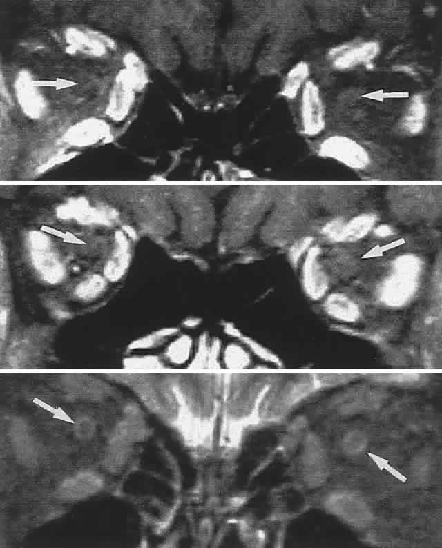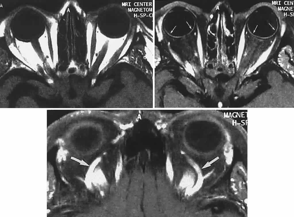 To facilitate maximal application of CT scanning or MRI procedures, the clinician must communicate to the technician or radiologist a specific request for multiple orbital sections and fat saturation protocols, and should indicate the principal clinical diagnostic considerations. As an anatomic guide for surgical exploration, neuroimaging provides critical spatial details, if not more precise diagnostic information. The ideal complementary comparison study to CT or MRI is standardized ultrasonography (echography), which not only defines gross morphologic configuration, but also is most useful in classifying tumors by tissue-density groups. Whereas CT and MRI provide precise anatomic localization, ultrasonography roughly indicates tissue composition. Such categorization of typical inflammation or tumor patterns closely correlates with histologic diagnoses. Furthermore, standardized echography (combined A-scan, contact B-scan, and Doppler ultrasound) is an efficient and convenient diagnostic modality that sensitively detects changes in extra-ocular muscle size (see Volume 2, Chapter 12, Fig. 30) and reflectivity (as noted above), accurately measures optic nerve size and sheath distension due to increased subarachnoid fluid, distinguishes abnormalities of vascular flow, and differentiates other orbital soft tissue changes.67 Many tumors show quite characteristic, if not pathognomonic, reflectivity patterns. Enlargement of the superior orbital vein is detected by ultrasonography,67,72 and by CT scan73 and MRI,74 the differential diagnosis of which includes carotid-cavernous fistula (see Volume 2, Chapter 17, Fig. 16), Graves' orbitopathy, orbital inflammation, meningioma invading the cavernous sinus, vascular lesions of the orbit, and diffuse cerebral swelling associated with ruptured aneurysms or intracerebral hematomas.75 Arteriography has never been a particularly useful technique in orbital disease, with the exception of suspected arteriovenous fistula or malformation, and with the advent of MRI and standardized ultrasonography the indications for arterial contrast studies are few. Unlike the venous injections for enhanced CT scanning, where complications are limited to idiosyncratic reactions to iodinated contrast media, or benign gadolinium contrast for MRI studies, arterial injections or catheterizations run a small but significant risk of embolic sequelae. In the patient with suspected arteriovenous fistula prepared to undergo surgical correction, selective vessel catheterization is required, coupled with photographic subtraction of bone images (See Volume 2, Chapter 17). The advent of CT, MRI, and ultrasonography has considerably simplified the radiodiagnostic assessment of orbital disease. Radionuclide scanning and positive contrast retrobulbar orbitography must now be considered obsolete, as are contrast studies of the venous system of the orbit and cavernous sinus. By becoming familiar with those points of medical historical significance, by applying simple examination techniques and learning to recognize suggestive (if not pathognomonic) signs, and by the judicious use of diagnostic techniques (principally CT scan, ultrasonography, and now MRI), the clinician need not be overwhelmed by orbital disease. Nor should the distinction, even on strictly clinical grounds, between neural and orbital causes of ophthalmoplegia be an insurmountable problem. |