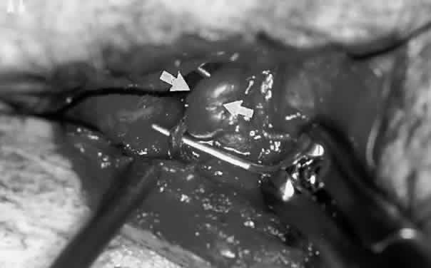 In the upper eyelid, the transseptal orbitotomy incision is best camouflaged within the upper eyelid crease. A 4-0 black silk traction suture is passed through the tarsal plate in a lamellar fashion, avoiding the marginal vascular arcade. When secured to the surgical drape inferiorly, this traction suture puts all lid structures posterior to the orbicularis on stretch, while allowing the overlying skin and orbicularis to be mobilized. The skin is incised along the lid crease initially marked with a scalpel. Hemostasis is achieved with a bipolar cautery. The skin and orbicularis muscles are tented anteriorly and a vertical cut is made in the avascular postorbicular fascial plane. A Westcott scissors is used to open this plane medially and laterally along the length of the wound. Gentle pressure applied to the globe will prolapse the orbital fat forward, bulging the shiny orbital septum. The septum is incised across the entire width of the upper eyelid to fully expose the preaponeurotic fat pad. Gentle palpation and blunt dissection of the orbital fat, coupled with careful placement of retractors, will facilitate exposure of the orbital lesion. After biopsy, excision, or drainage, the wound is closed in layers. The orbital septum is not closed as a separate layer. The reformation of the crease is accomplished by suturing the pretarsal skin-muscle edge to the levator aponeurosis. Four to five sutures are usually adequate to form a good eyelid crease. The remainder of the incision is closed with a running suture. In patients with unsuccessful transarterial embolization of cavernous-dural fistulas, a medial lid crease or a sub-brow incision can be used to locate the dilated anterior superior ophthalmic vein for transvenous embolization (Fig. 23; see also Volume 2, Chapter 17, Fig. 21C). Sharp dissection is carried superiorly in the preseptal plane until the arcus marginalis is reached. The orbital septum is incised along the width of the skin incision. The trochlea and superior oblique tendon are identified and insulated with neurosurgical cottonoids. The orbital fat adjacent to the trochlea is moved laterally with a pair of malleable retractors. Orbital fat septa are bluntly dissected apart to prolapse the superior ophthalmic vein forward. Once identified, the vessel is insulated with ½-inch neurosurgical cottonoids to prevent herniating fat from obscuring the surgical field. Two 2-0 silk ligatures are placed around the vein for traction. A guidewire is introduced through a venipuncture between the two ligatures. An angiographic catheter is threaded over the guidewire and secured to the vessel with a silk suture. With successful closure of the shunt, the vessel is no longer arterialized. The silk ligatures are then loosened and the venipuncture site cauterized with a bipolar cautery.
