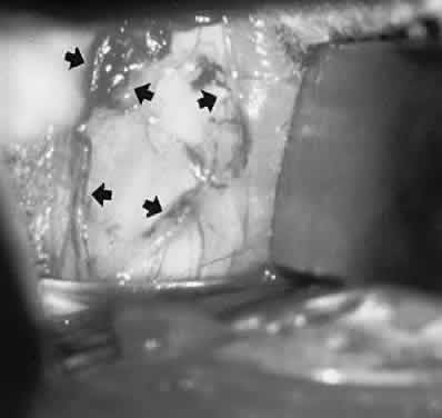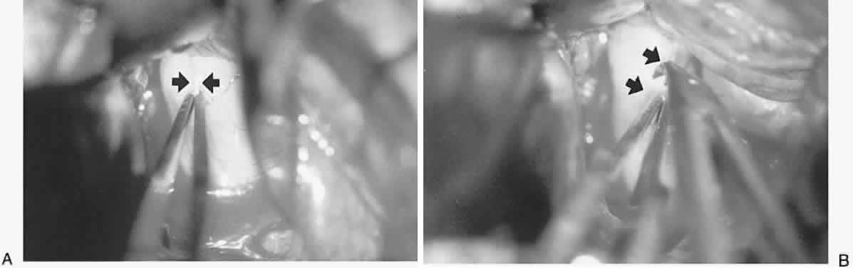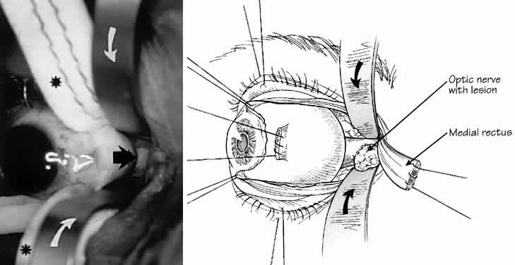 appearance alone may be misleading. Surgical decompression of the optic nerve should be considered sooner rather than later, and certainly before major field or acuity defects occur. To reiterate, because early damage to the optic disc manifests as peripheral visual field constriction, with normal visual acuity, progressive constriction of visual field is a consideration for surgical intervention, even if central visual acuity is not affected. Progression of visual loss despite maximum medical therapy is sufficient reason for optic nerve sheath decompression. Neurosurgical craniectomy for subtemporal bone resection is now rarely performed, and various ventricular shunt procedures are frought with risks of infection or shunt blockage, with variable long-term results. Indeed, the use of lumboperitoneal shunts has decreased, as optic nerve sheath fenestration has proven to be more effective, with fewer complications and with less morbidity. Optic nerve sheath fenestration is a well-accepted surgical technique employed to preserve vision in patients with papilledema that threatens vision. Indeed, DeWecker91 first described optic nerve decompression in 1872. Preoperative screening for metabolic or electrolyte abnormalities must be performed in patients who have been receiving long-term medical therapy, especially carbonic anhydrase inhibitors or diuretics. Systemic hypertension may contribute to optic disc damage and visual morbidity in these patients. Although systemic hypertension should be treated, abrupt or drastic reduction of blood pressure must be avoided since it may result in hypoperfusion to the optic disc in the presence of marked disc edema. Access to the optic nerve sheath can be achieved either through the medial transconjunctival approach, via a lateral orbitotomy, or by a combination of these two methods. The optimal optic nerve exposure is achieved by performing a lateral orbitotomy with bone removal.92 This approach is useful in patients with failed medial approach, or for patients with a previous scleral buckle that limits optic nerve exposure. The medial approach involves disinsertion of the medial rectus muscle to access the intraconal space and the optic nerve. A lid speculum is used to retract the eyelids, and a protective shield is placed over the other eye. A 180° conjunctival peritomy is performed along the medial limbus from the 12 o'clock to 6 o'clock positions. A tenotomy scissors is used to bluntly dissect along the sclera in the superonasal and inferonasal quadrants. The medial rectus muscle is isolated with a muscle hook and the intramuscular attachments are severed. A double-armed 5-0 polygalactin suture is passed partial thickness through the medial rectus muscle just behind the insertion, with locking full-thickness suture bites at the upper and lower muscle margins, as is standard in muscle displacement strabismus surgery. The medial rectus muscle is disinserted and retracted medially using the aforementioned suture. While good exposure is key for all orbital surgery, it is especially important for medial exploration of the intraconal space. It is critically important to recognize important anatomic landmarks. The vortex veins number between four and eight and lie 5 to 8 mm posterior to the equator of the globe. They are close to the vertical meridian and are most commonly seen in the temporal quadrants. The short posterior ciliary arteries branch from the ophthalmic artery to encircle the optic nerve. The paired long posterior ciliary arteries also course on either side of the optic nerve. Violation of any of these vascular structures can lead to serious hemorrhaging, which could jeopardize the surgical procedure or visual function of the eye. The intraconal space is now accessible by following the space between the sclera and the medial rectus. Two malleable ribbon retractors (1 cm in width) are bent 90° to form a right angle. The two retractors are used to enter the medial orbit oriented and in alignment with the medial rectus. Once the malleable retractors are in the intraconal space just behind the globe they are rotated 90° so that the retractors are oriented superiorly and inferiorly. The retractors are then separated to expose the intraconal space with the retraction away from the optic nerve and medial rectus muscle (Fig. 24). Neurosurgical cottonoids are used to assist in retracting the orbital fat superiorly and inferiorly. The optic nerve sheath may still be obscured by surrounding orbital fat, which is separated just behind the globe using two periosteal elevators. The malleable retractors and cottonoids are repositioned to retract the separated fat. The fat dissection is performed carefully until the optic nerve sheath is exposed. Throughout the procedure all retraction is directed superiorly and inferiorly to eliminate traction on the globe or optic nerve. The pupil is monitored for dilation during the procedure, which would indicate manipulation of the posterior ciliary nerves. If this occurs, dissection is stopped and the malleable retractors are repositioned to reduce traction against the ciliary nerve fibers. Once the retrobulbar portion of the optic nerve is exposed, a binocular-operating microscope mounted on a Contraves (Contraves, Zurich) stand is moved into position. This stand provides a unique balancing system, allowing rapid, stable adjustments for different viewing angles during surgery. Under microscopic visualization, adipose tissue surrounding the bulbous portion of the nerve immediately behind the globe is gently retracted. The short ciliary nerve, the posterior ciliary arteries, and the fine vascular plexus made up of collateral branches of the ophthalmic artery on the epidural surface should be identified (Fig. 25). Extreme care must be exercised to preserve the fine vasculature surrounding and supplying the nerve; these vessels should be neither manipulated nor cauterized. Blood vessels and ciliary nerves are brushed be
