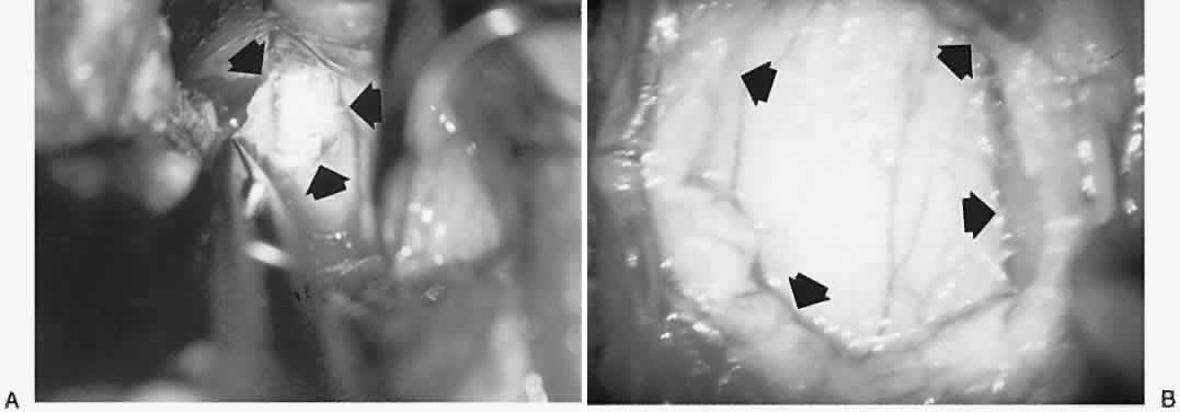 The dura of the distal bulbous portion of the optic nerve sheath is best grasped with a fine neurosurgical microforceps and incised with a bayonet microsurgical scissors (Fig. 26). As the dura is incised, arachnoid bulges slightly through the incision. The arachnoid and the edge of the dura are then regrasped together with the forceps, and the subarachnoid space is entered by snipping the arachnoid with the microscissors. Because CSF escapes once the arachnoid is incised, it is important to prevent the arachnoid from collapsing onto the pia. The arachnoid and dura should be excised without touching the pia. One blade of the microscissors is inserted into the subarachnoid space, and a rectangular window at least 3 × 5 mm is excised from the sheath (Fig. 27). If an epidural vessel is inadvertently cut, hemostasis can be obtained by gentle pressure on the cut edge of the vessel with a cotton-tip applicator; bipolar cauterization is often not necessary. The dural edge of the window is examined with a microforceps; two distinct cut edges should be seen: the arachnoid and the overlying dura. The arachnoid layer within the sheath window must be excised since an intact arachnoid is an effective barrier to CSF egress. The malleable retractors and cottonoids are then removed from the wound. Some surgeons prefer to use a blade and make several slits on the nerve sheath instead of a window, but there are no data that show any advantage. Once hemostasis has been assured, the medial rectus is reattached at its insertion with the preplaced polygalactin muscle margin sutures. The conjunctiva is closed with interrupted 6-0 plain gut suture. The lateral orbitotomy is patterned after that described by Stallard, which was described earlier. After en bloc removal of the bone of the lateral orbital wall, a T-shaped periorbital incision is made. Dissection within the central surgical space to gain access to the optic nerve is performed with malleable orbital retractors. As with the medial approach, the most difficult feature of lateral access is the tendency of orbital fat to obscure normal anatomic landmarks. The fat lobules often billow over the edges of the retractors, obscuring the plane of dissection. Using ½-inch (13-mm) neurosurgical cottonoids to insulate the billowing orbital fat lobules can eliminate this problem. By gradually removing and reinserting the orbital retractor blades over the cottonoids, the fat can be displaced from the plane of dissection. The optic nerve can be reached easily if posterior dissection follows the surface of the scleral wall. The nerve sheath fenestration is performed as described above for the medial approach. After optic nerve fenestration is effected, the periorbita is reapproximated with interrupted 5-0 poly-galactin sutures. The lateral orbital wall bone fragment is replaced and fixed with a nonabsorbable suture in the preplaced drill holes. The periosteum, muscle, subcutaneous tissues, and skin are closed in separate layers. Kersten and Kulwin93 described a lateral approach without bone removal. This approach begins with a lateral canthotomy, and sharp dissection is carried down to the periosteum at the lateral orbital rim. A 4-0 silk suture is passed beneath the lateral rectus muscle and used to adduct the eye. The periosteum at the lateral rim is incised from the frontozygomatic suture to the zygomatic arch. A periosteal elevator is used to elevate the periosteum and the periorbita approximately 2-mm posterior to the rim. A T-shaped incision is made in the periorbita and the flaps are retracted with 4-0 silk sutures. The lacrimal gland is then identified immediately within the periorbita and retracted superiorly with a Sewell retractor. The lateral rectus muscle is then identified and retracted inferiorly. The plane of blunt dissection is between the lacrimal gland and the lateral rectus muscle. The retractors and cottonoids are repositioned as the dissection proceeds toward the nerve. Once the optic nerve is identified, the overlying ciliary nerves and blood vessels are cleared from the fenestration site; fenestration is performed in the same manner as described before. The lateral canthal angle is reapproximated with a double-armed 6-0 polygalactin suture and the skin is close with 7-0 nylon. The advantages of this technique are that bone does not need to be removed and the rectus muscle does not need to be disinserted. The potential complications of optic nerve sheath fenestration include diplopia, pupillary dilation, angle closure glaucoma, conjunctival bleb, microhyphema, infection, decreased vision, and loss of vision. The most common complication of the medial approach is transient adduction deficit. A disadvantage of the lateral approach is the location of the ciliary ganglion on the lateral aspect of the optic nerve. Damage to the ganglion or to the ciliary nerves can result in pupillary and accommodation abnormalities. Another potential concern is the location of the papillomacular bundle nerve fibers along the lateral side of the optic nerve, although there is no evidence of different visual outcomes based on the surgical approach. The most severe complication of this procedure is permanent visual loss. This may be due to direct trauma to the optic nerve or central retinal artery occlusion. The incidence of permanent visual loss from optic nerve decompression has been reported as low as 2%. However, results of several clinical studies clearly have validated the efficacy of optic nerve sheath fenestration as an effective and safe surgical treatment to limit visual loss in idiopathic intracranial hypertension.92–95 Optic sheath fenestration may also have a role in the treatment of optic nerve sheath hemorrhage, acute retinal necrosis, and papilledema secondary to a nonresectable central nervous system mass. There is no substantial evidence to indicate that nerve sheath decompression is useful in the treatment of the progressive form of nonarteritic a
