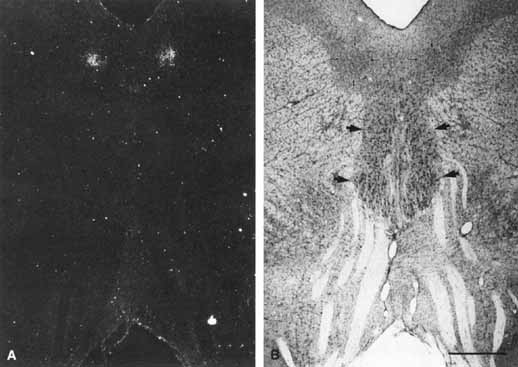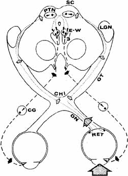 Mechanically, the diameter of the pupil is determined by the antagonistic actions of the iris sphincter and dilator muscles, with the radially arranged dilator fibers playing the minor role. The dilator muscle inserts at the iris root and extends from there to an area about 2 mm from the pupillary margin. The sphincter muscle has circumferential fibers, is more superficial in the iris stroma, and occupies an area about 2 to 4 mm from the pupillary margin. The sphincter can be seen in light or atrophic irides. Rather than retracting toward one quadrant when severed or ruptured, the sphincter continues to function except in the altered segment. Therefore, with prudence, the pupillary reactions may be evaluated even in the presence of iris atrophy, traumatic rupture of the sphincter, and congenital or surgical coloboma. LIGHT REFLEX PATHWAYThe pupillary light reflex pathway may be functionally considered a three-neuron arc (see Fig. 1): the afferent neurons from retinal ganglion cells to the pretectal area; an intercalated neuron from the pretectal complex to the parasympathetic motor pool (Edinger–Westphal nucleus) of the oculomotor nuclear complex and the efferent parasympathetic outflow with the oculomotor nerve to the ciliary ganglion; and from there to the pupillary sphincter. Considerable evidence exists that the visual cells of the retina (i.e., the rods and cones) also serve as light receptors, controlling pupillomotor activity. For example, pupillomotor light thresholds follow the same shifts in spectral sensitivity as visual thresholds, depending on the state of light adaptation of the retina (Purkinje shift). Pupillomotor sensitivity of the retina also parallels visual form sensitivity, which is highest at the fovea and lowest in the periphery. In our present state of knowledge, it seems that the same afferent axons in the optic nerve transmit pupillomotor information to the pretectal area and visual information to the lateral geniculate nuclei. It is suspected, but unproved, that this dual function is accomplished by axonal bifurcation in the optic tract in humans.8 Therefore, we may consider two intimately related systems: retinogeniculate for visual perception and retinomesencephalic for pupillomotor control and foveation. At the optic chiasm, slightly more than one half of the afferent axons in the optic nerve cross to the opposite optic tract, where they are mixed with noncrossing axons from the contralateral optic nerve. The ratio of crossed to uncrossed fibers is approximately 53:47.9 From the chiasmal level posteriorly, afferent visual and pupillomotor information from either eye is divided into crossed fibers (from nasal retinal receptors of the contralateral eye) and uncrossed fibers (from temporal retinal receptors of the ipsilateral eye). In the posterior aspect of the optic tract (pregeniculate), the pupillomotor branches of the afferent axons gain the pretectal nuclear area by transversing the brachium of the superior colliculus into the rostral midbrain. Intercalated neurons interconnect from the preolivary nucleus of the pos-terior commissure and lentiform nucleus10 to the Edinger–Westphal nuclei by crossing dorsal to the aqueduct in the posterior commissure and by coursing ventrally in the periaqueductal gray matter. This simplistic anatomic approach belies the true complexity of the neurophysiology and neuroanatomy of the pretectal nuclear complex. The reader is referred to articles by Smith et al.,10 Carpenter and Pierson,12 Benevento et al.,13 Burde,14 and Irene Loewenfeld's1 textbook. The organization of the oculomotor nuclear complex in the mesencephalon (midbrain) depicted by Warwick15 in 1953 and Jampel and Mindel16 in 1967 was modified by Burde and Loewy17 and Burde,14 recognizing the anterior median nucleus rostrally and accessory cell columns caudally. The anteromedian nucleus is the source of special visceral efferent motor axons to the iris sphincter and ciliary musculature. This dorsal cell mass may be subdivided into a rostral portion associated with accommodation, a caudal portion—the stimulation of which produces pupil constriction, and a midportion associated with both accommodation and constriction. Direct input to the iris sphincter and ciliary body may also be provided by the nucleus of Perlia.10,17 The pretectal olivary nuclei receive direct retinal input and, in turn, provide direct input to the Edinger–Westphal nucleus. The exact location of the Edinger–Westphal nucleus in humans is not known. Kourouyan and Horton18 injected tritiated H-proline into macaque monkey eyes and found the primary pretectal retinal projections terminating in the olivary nuclei, ipsilaterally and contralaterally. The label for the Edinger–Westphal nucleus was found bilaterally in the midbrain, ventral to the cerebral aqueduct, in the central gray matter, in well-defined columns, corresponding to an area termed the lateral visceral column in the classic literature (Fig. 4). Using multiple markers, including wheat germ agglutin, May and Fratkin19 have further isolated the Edinger-Westphal nucleus in the macaque monkey and deduced that it is comprised of a solitary column of cells. Whether this is the case in humans remains to be determined. According to the degeneration studies by Warwick,20 the ciliary ganglion contains more cells for innervation of the ciliary muscles than for innervation of the iris sphincter (about 30:1). Presumably, that same ratio occurs in the Edinger–Westphal nucleus, although the presence of diffuse projections may argue against it. From the parasympathetic nucleus, the pupillomotor and ciliary fibers join the outflow of the oculomotor nuclei and exit from the substance of the midbrain with the oculomotor nerves as multiple rootlets in the interpeduncular space. According to Kerr and Hollowell,21 the pupillomotor fibers are located superficially in the nerve, lying just internal to the epineurium. It is believed that this super