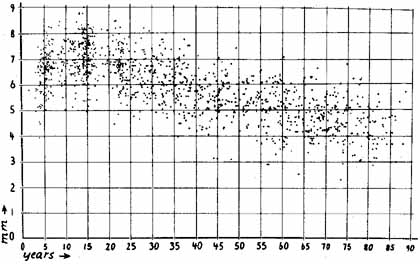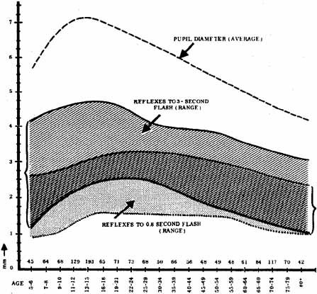 At a given moment, any or all of the aforementioned factors may variably influence pupillary size and reactivity. It should be no wonder, then, that in the awake state, the pupil is rather constantly moving, a condition of physiologic unrest termed hippus. This incessant change in pupil size has no pathologic significance,4 although it is described in diverse conditions ranging from encephalitis to schizophrenia and from cataracts to hemorrhoids. Age affects both pupillary size and reactivity.5,6 The pupil of the neonate is miotic but increases in size during the first decade of life; from the second decade on, the pupil steadily becomes smaller (Fig. 2). Pupillary reactivity, at least to “long” (3-second) light flashes, also seems related to age; the range of amplitude of the light reflex declines with increasing age (Fig. 3). Decreased central sympathetic inhibition to the Edinger-Westphal nucleus has been implicated as the mechanism for age-related diminished pupil size in dim illumination.2