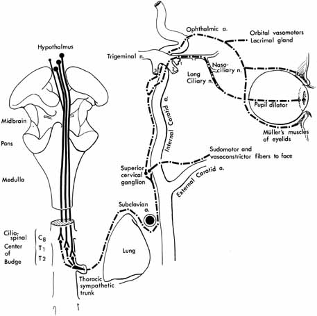 During sleep and obtunded states, these supranuclear inhibitory influences are diminished, with resultant miotic but reactive pupils. Arousal results in pupil dilatation because of the return of supranuclear inhibition. Sympathectomy does not eliminate this dilatation. OCULOSYMPATHETIC PATHWAYSSympathetic outflow to the iris dilator muscles begins in the posterolateral area of the hypothalamus and descends uncrossed through the tegmentum of the midbrain and pons (Fig. 5). At the level of the medulla, the sympathetics lie laterally, where they may be affected in lateral medullary plate infarction (i.e., Wallenberg's syndrome). The descending fibers, considered first-order preganglionic neurons, terminate in the intermediolateral cell column at the C8 to T2 cord level (the ciliospinal center of Budge). Second-order preganglionic fibers exit the cord primarily with the first ventral thoracic root (T1), but some pupillomotor sympathetics egress with C8 or T2. Via the white rami communicantes, the fibers enter the paravertebral sympathetic chain, which is closely related to the pleura of the lung apex. At this location, the sympathetics may be affected by neoplasms, (i.e., the Pancoast's syndrome; see discussion of Horner's syndrome).