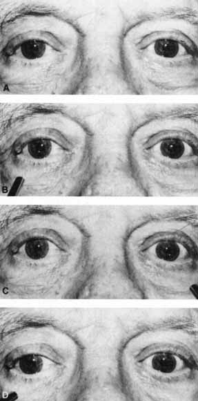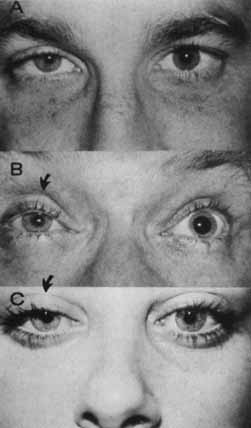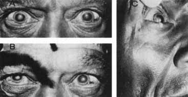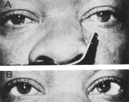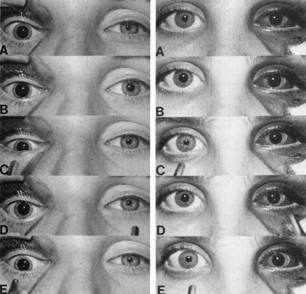 Transient pupillary distortion with segmental iris dilator spasm has been reported by Thompson207 and termed tadpole pupil. The condition probably represents a subset of the larger group of patients who carry the less precise diagnosis of springing pupil. The clinical pattern and prognosis of patients with tadpole pupil appear to be similar to those described previously. Periodic unilateral pupil dilation has been reported in association with migraine.207,208,209,210,211 Suggested causes for the periodic mydriasis include transient sympathetic hyperactivity207 or transient parasympatholytic activity209,210 or both,212 perhaps as a variant of ophthalmologic migraine. Oculosympathetic spasm has been observed several months after spinal cord injury,213 and, according to the authors, the pupillary dilation, brought on by elevation and stretch of the ipsilateral arm or leg, possibly represents a localized form of autonomic hyperreflexia. Because a fixed dilated pupil in an unconscious patient is usually interpreted as a sign of temporal lobe herniation or aneurysmal compression, it should be noted that transient unilateral mydriasis on occasion may accompany convulsive disorders in children214,215 or in adults.216 |